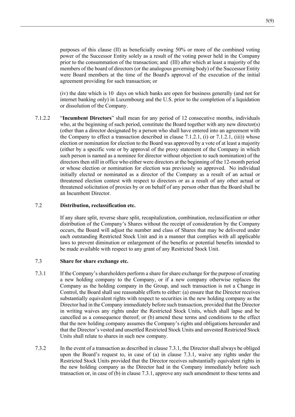 5(9) purposes of this clause (II) as beneficially owning 50% or more of the combined voting power of the Successor Entity solely as a result of the voting power held in the Company prior to the consummation of the transaction; and (III) after which at least a majority of the members of the board of directors (or the analogous governing body) of the Successor Entity were Board members at the time of the Board's approval of the execution of the initial agreement providing for such transaction; or (iv) the date which is 10 days on which banks are open for business generally (and not for internet banking only) in Luxembourg and the U.S. prior to the completion of a liquidation or dissolution of the Company. 7.1.2.2 “Incumbent Directors” shall mean for any period of 12 consecutive months, individuals who, at the beginning of such period, constitute the Board together with any new director(s) (other than a director designated by a person who shall have entered into an agreement with the Company to effect a transaction described in clause 7.1.2.1, (i) or 7.1.2.1, (iii)) whose election or nomination for election to the Board was approved by a vote of at least a majority (either by a specific vote or by approval of the proxy statement of the Company in which such person is named as a nominee for director without objection to such nomination) of the directors then still in office who either were directors at the beginning of the 12-month period or whose election or nomination for election was previously so approved. No individual initially elected or nominated as a director of the Company as a result of an actual or threatened election contest with respect to directors or as a result of any other actual or threatened solicitation of proxies by or on behalf of any person other than the Board shall be an Incumbent Director. 7.2 Distribution, reclassification etc. If any share split, reverse share split, recapitalization, combination, reclassification or other distribution of the Company’s Shares without the receipt of consideration by the Company occurs, the Board will adjust the number and class of Shares that may be delivered under each outstanding Restricted Stock Unit and in a manner that complies with all applicable laws to prevent diminution or enlargement of the benefits or potential benefits intended to be made available with respect to any grant of any Restricted Stock Unit. 7.3 Share for share exchange etc. 7.3.1 If the Company’s shareholders perform a share for share exchange for the purpose of creating a new holding company to the Company, or if a new company otherwise replaces the Company as the holding company in the Group, and such transaction is not a Change in Control, the Board shall use reasonable efforts to either: (a) ensure that the Director receives substantially equivalent rights with respect to securities in the new holding company as the Director had in the Company immediately before such transaction, provided that the Director in writing waives any rights under the Restricted Stock Units, which shall lapse and be cancelled as a consequence thereof; or (b) amend these terms and conditions to the effect that the new holding company assumes the Company’s rights and obligations hereunder and that the Director’s vested and unsettled Restricted Stock Units and unvested Restricted Stock Units shall relate to shares in such new company. 7.3.2 In the event of a transaction as described in clause 7.3.1, the Director shall always be obliged upon the Board’s request to, in case of (a) in clause 7.3.1, waive any rights under the Restricted Stock Units provided that the Director receives substantially equivalent rights in the new holding company as the Director had in the Company immediately before such transaction or, in case of (b) in clause 7.3.1, approve any such amendment to these terms and