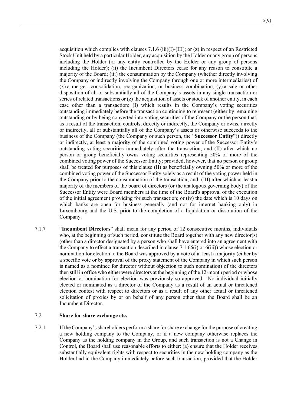 5(9) acquisition which complies with clauses 7.1.6 (iii)(I)-(III); or (z) in respect of an Restricted Stock Unit held by a particular Holder, any acquisition by the Holder or any group of persons including the Holder (or any entity controlled by the Holder or any group of persons including the Holder); (ii) the Incumbent Directors cease for any reason to constitute a majority of the Board; (iii) the consummation by the Company (whether directly involving the Company or indirectly involving the Company through one or more intermediaries) of (x) a merger, consolidation, reorganization, or business combination, (y) a sale or other disposition of all or substantially all of the Company’s assets in any single transaction or series of related transactions or (z) the acquisition of assets or stock of another entity, in each case other than a transaction: (I) which results in the Company’s voting securities outstanding immediately before the transaction continuing to represent (either by remaining outstanding or by being converted into voting securities of the Company or the person that, as a result of the transaction, controls, directly or indirectly, the Company or owns, directly or indirectly, all or substantially all of the Company’s assets or otherwise succeeds to the business of the Company (the Company or such person, the “Successor Entity”)) directly or indirectly, at least a majority of the combined voting power of the Successor Entity’s outstanding voting securities immediately after the transaction, and (II) after which no person or group beneficially owns voting securities representing 50% or more of the combined voting power of the Successor Entity; provided, however, that no person or group shall be treated for purposes of this clause (II) as beneficially owning 50% or more of the combined voting power of the Successor Entity solely as a result of the voting power held in the Company prior to the consummation of the transaction; and (III) after which at least a majority of the members of the board of directors (or the analogous governing body) of the Successor Entity were Board members at the time of the Board's approval of the execution of the initial agreement providing for such transaction; or (iv) the date which is 10 days on which banks are open for business generally (and not for internet banking only) in Luxembourg and the U.S. prior to the completion of a liquidation or dissolution of the Company. 7.1.7 “Incumbent Directors” shall mean for any period of 12 consecutive months, individuals who, at the beginning of such period, constitute the Board together with any new director(s) (other than a director designated by a person who shall have entered into an agreement with the Company to effect a transaction described in clause 7.1.66(i) or 6(iii)) whose election or nomination for election to the Board was approved by a vote of at least a majority (either by a specific vote or by approval of the proxy statement of the Company in which such person is named as a nominee for director without objection to such nomination) of the directors then still in office who either were directors at the beginning of the 12-month period or whose election or nomination for election was previously so approved. No individual initially elected or nominated as a director of the Company as a result of an actual or threatened election contest with respect to directors or as a result of any other actual or threatened solicitation of proxies by or on behalf of any person other than the Board shall be an Incumbent Director. Share for share exchange etc. 7.2.1 If the Company’s shareholders perform a share for share exchange for the purpose of creating a new holding company to the Company, or if a new company otherwise replaces the Company as the holding company in the Group, and such transaction is not a Change in Control, the Board shall use reasonable efforts to either: (a) ensure that the Holder receives substantially equivalent rights with respect to securities in the new holding company as the Holder had in the Company immediately before such transaction, provided that the Holder