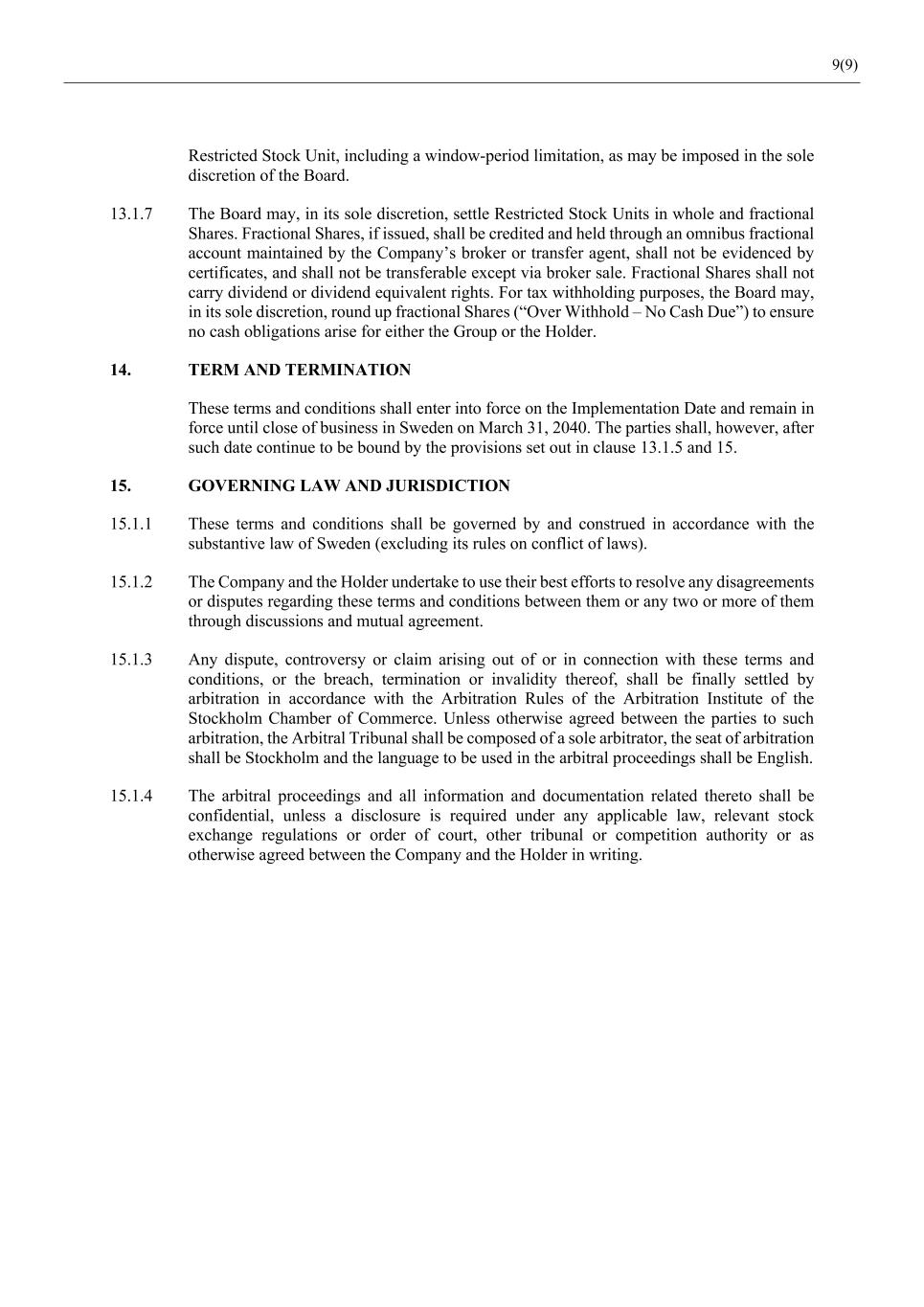 9(9) Restricted Stock Unit, including a window-period limitation, as may be imposed in the sole discretion of the Board. 13.1.7 The Board may, in its sole discretion, settle Restricted Stock Units in whole and fractional Shares. Fractional Shares, if issued, shall be credited and held through an omnibus fractional account maintained by the Company’s broker or transfer agent, shall not be evidenced by certificates, and shall not be transferable except via broker sale. Fractional Shares shall not carry dividend or dividend equivalent rights. For tax withholding purposes, the Board may, in its sole discretion, round up fractional Shares (“Over Withhold – No Cash Due”) to ensure no cash obligations arise for either the Group or the Holder. 14. TERM AND TERMINATION These terms and conditions shall enter into force on the Implementation Date and remain in force until close of business in Sweden on March 31, 2040. The parties shall, however, after such date continue to be bound by the provisions set out in clause 13.1.5 and 15. 15. GOVERNING LAW AND JURISDICTION 15.1.1 These terms and conditions shall be governed by and construed in accordance with the substantive law of Sweden (excluding its rules on conflict of laws). 15.1.2 The Company and the Holder undertake to use their best efforts to resolve any disagreements or disputes regarding these terms and conditions between them or any two or more of them through discussions and mutual agreement. 15.1.3 Any dispute, controversy or claim arising out of or in connection with these terms and conditions, or the breach, termination or invalidity thereof, shall be finally settled by arbitration in accordance with the Arbitration Rules of the Arbitration Institute of the Stockholm Chamber of Commerce. Unless otherwise agreed between the parties to such arbitration, the Arbitral Tribunal shall be composed of a sole arbitrator, the seat of arbitration shall be Stockholm and the language to be used in the arbitral proceedings shall be English. 15.1.4 The arbitral proceedings and all information and documentation related thereto shall be confidential, unless a disclosure is required under any applicable law, relevant stock exchange regulations or order of court, other tribunal or competition authority or as otherwise agreed between the Company and the Holder in writing.