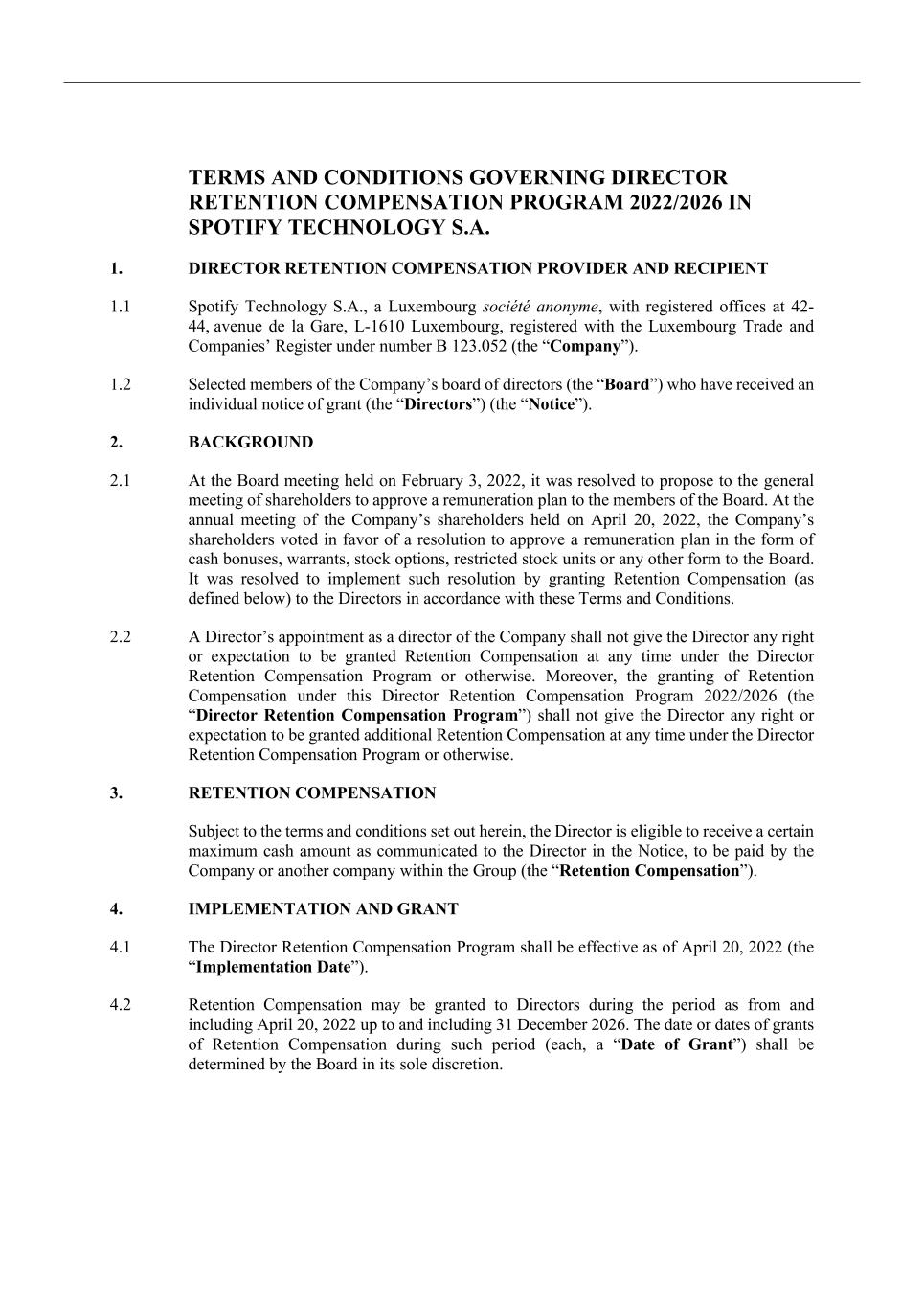 TERMS AND CONDITIONS GOVERNING DIRECTOR RETENTION COMPENSATION PROGRAM 2022/2026 IN SPOTIFY TECHNOLOGY S.A. 1. DIRECTOR RETENTION COMPENSATION PROVIDER AND RECIPIENT 1.1 Spotify Technology S.A., a Luxembourg société anonyme, with registered offices at 42- 44, avenue de la Gare, L-1610 Luxembourg, registered with the Luxembourg Trade and Companies’ Register under number B 123.052 (the “Company”). 1.2 Selected members of the Company’s board of directors (the “Board”) who have received an individual notice of grant (the “Directors”) (the “Notice”). 2. BACKGROUND 2.1 At the Board meeting held on February 3, 2022, it was resolved to propose to the general meeting of shareholders to approve a remuneration plan to the members of the Board. At the annual meeting of the Company’s shareholders held on April 20, 2022, the Company’s shareholders voted in favor of a resolution to approve a remuneration plan in the form of cash bonuses, warrants, stock options, restricted stock units or any other form to the Board. It was resolved to implement such resolution by granting Retention Compensation (as defined below) to the Directors in accordance with these Terms and Conditions. 2.2 A Director’s appointment as a director of the Company shall not give the Director any right or expectation to be granted Retention Compensation at any time under the Director Retention Compensation Program or otherwise. Moreover, the granting of Retention Compensation under this Director Retention Compensation Program 2022/2026 (the “Director Retention Compensation Program”) shall not give the Director any right or expectation to be granted additional Retention Compensation at any time under the Director Retention Compensation Program or otherwise. 3. RETENTION COMPENSATION Subject to the terms and conditions set out herein, the Director is eligible to receive a certain maximum cash amount as communicated to the Director in the Notice, to be paid by the Company or another company within the Group (the “Retention Compensation”). 4. IMPLEMENTATION AND GRANT 4.1 The Director Retention Compensation Program shall be effective as of April 20, 2022 (the “Implementation Date”). 4.2 Retention Compensation may be granted to Directors during the period as from and including April 20, 2022 up to and including 31 December 2026. The date or dates of grants of Retention Compensation during such period (each, a “Date of Grant”) shall be determined by the Board in its sole discretion.