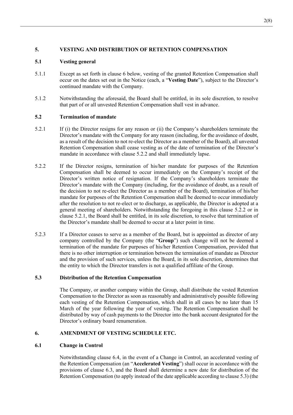 2(8) 5. VESTING AND DISTRIBUTION OF RETENTION COMPENSATION 5.1 Vesting general 5.1.1 Except as set forth in clause 6 below, vesting of the granted Retention Compensation shall occur on the dates set out in the Notice (each, a “Vesting Date”), subject to the Director’s continued mandate with the Company. 5.1.2 Notwithstanding the aforesaid, the Board shall be entitled, in its sole discretion, to resolve that part of or all unvested Retention Compensation shall vest in advance. 5.2 Termination of mandate 5.2.1 If (i) the Director resigns for any reason or (ii) the Company’s shareholders terminate the Director’s mandate with the Company for any reason (including, for the avoidance of doubt, as a result of the decision to not re-elect the Director as a member of the Board), all unvested Retention Compensation shall cease vesting as of the date of termination of the Director’s mandate in accordance with clause 5.2.2 and shall immediately lapse. 5.2.2 If the Director resigns, termination of his/her mandate for purposes of the Retention Compensation shall be deemed to occur immediately on the Company’s receipt of the Director’s written notice of resignation. If the Company’s shareholders terminate the Director’s mandate with the Company (including, for the avoidance of doubt, as a result of the decision to not re-elect the Director as a member of the Board), termination of his/her mandate for purposes of the Retention Compensation shall be deemed to occur immediately after the resolution to not re-elect or to discharge, as applicable, the Director is adopted at a general meeting of shareholders. Notwithstanding the foregoing in this clause 5.2.2 or in clause 5.2.1, the Board shall be entitled, in its sole discretion, to resolve that termination of the Director’s mandate shall be deemed to occur at a later point in time. 5.2.3 If a Director ceases to serve as a member of the Board, but is appointed as director of any company controlled by the Company (the “Group”) such change will not be deemed a termination of the mandate for purposes of his/her Retention Compensation, provided that there is no other interruption or termination between the termination of mandate as Director and the provision of such services, unless the Board, in its sole discretion, determines that the entity to which the Director transfers is not a qualified affiliate of the Group. 5.3 Distribution of the Retention Compensation The Company, or another company within the Group, shall distribute the vested Retention Compensation to the Director as soon as reasonably and administratively possible following each vesting of the Retention Compensation, which shall in all cases be no later than 15 March of the year following the year of vesting. The Retention Compensation shall be distributed by way of cash payments to the Director into the bank account designated for the Director’s ordinary board renumeration. 6. AMENDMENT OF VESTING SCHEDULE ETC. 6.1 Change in Control Notwithstanding clause 6.4, in the event of a Change in Control, an accelerated vesting of the Retention Compensation (an “Accelerated Vesting”) shall occur in accordance with the provisions of clause 6.3, and the Board shall determine a new date for distribution of the Retention Compensation (to apply instead of the date applicable according to clause 5.3) (the