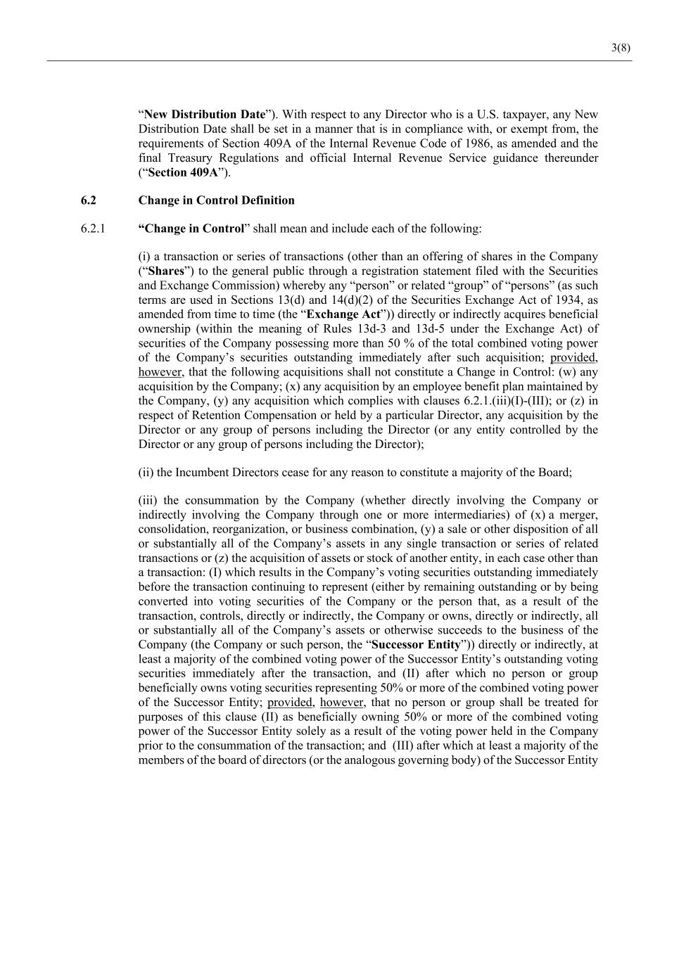3(8) “New Distribution Date”). With respect to any Director who is a U.S. taxpayer, any New Distribution Date shall be set in a manner that is in compliance with, or exempt from, the requirements of Section 409A of the Internal Revenue Code of 1986, as amended and the final Treasury Regulations and official Internal Revenue Service guidance thereunder (“Section 409A”). 6.2 Change in Control Definition 6.2.1 “Change in Control” shall mean and include each of the following: (i) a transaction or series of transactions (other than an offering of shares in the Company (“Shares”) to the general public through a registration statement filed with the Securities and Exchange Commission) whereby any “person” or related “group” of “persons” (as such terms are used in Sections 13(d) and 14(d)(2) of the Securities Exchange Act of 1934, as amended from time to time (the “Exchange Act”)) directly or indirectly acquires beneficial ownership (within the meaning of Rules 13d-3 and 13d-5 under the Exchange Act) of securities of the Company possessing more than 50 % of the total combined voting power of the Company’s securities outstanding immediately after such acquisition; provided, however, that the following acquisitions shall not constitute a Change in Control: (w) any acquisition by the Company; (x) any acquisition by an employee benefit plan maintained by the Company, (y) any acquisition which complies with clauses 6.2.1.(iii)(I)-(III); or (z) in respect of Retention Compensation or held by a particular Director, any acquisition by the Director or any group of persons including the Director (or any entity controlled by the Director or any group of persons including the Director); (ii) the Incumbent Directors cease for any reason to constitute a majority of the Board; (iii) the consummation by the Company (whether directly involving the Company or indirectly involving the Company through one or more intermediaries) of (x) a merger, consolidation, reorganization, or business combination, (y) a sale or other disposition of all or substantially all of the Company’s assets in any single transaction or series of related transactions or (z) the acquisition of assets or stock of another entity, in each case other than a transaction: (I) which results in the Company’s voting securities outstanding immediately before the transaction continuing to represent (either by remaining outstanding or by being converted into voting securities of the Company or the person that, as a result of the transaction, controls, directly or indirectly, the Company or owns, directly or indirectly, all or substantially all of the Company’s assets or otherwise succeeds to the business of the Company (the Company or such person, the “Successor Entity”)) directly or indirectly, at least a majority of the combined voting power of the Successor Entity’s outstanding voting securities immediately after the transaction, and (II) after which no person or group beneficially owns voting securities representing 50% or more of the combined voting power of the Successor Entity; provided, however, that no person or group shall be treated for purposes of this clause (II) as beneficially owning 50% or more of the combined voting power of the Successor Entity solely as a result of the voting power held in the Company prior to the consummation of the transaction; and (III) after which at least a majority of the members of the board of directors (or the analogous governing body) of the Successor Entity