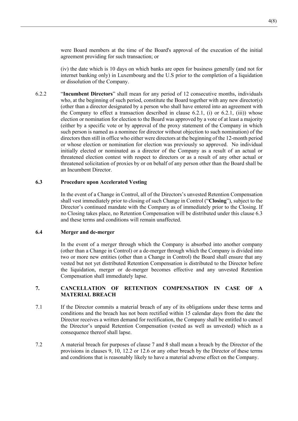4(8) were Board members at the time of the Board's approval of the execution of the initial agreement providing for such transaction; or (iv) the date which is 10 days on which banks are open for business generally (and not for internet banking only) in Luxembourg and the U.S prior to the completion of a liquidation or dissolution of the Company. 6.2.2 “Incumbent Directors” shall mean for any period of 12 consecutive months, individuals who, at the beginning of such period, constitute the Board together with any new director(s) (other than a director designated by a person who shall have entered into an agreement with the Company to effect a transaction described in clause 6.2.1, (i) or 6.2.1, (iii)) whose election or nomination for election to the Board was approved by a vote of at least a majority (either by a specific vote or by approval of the proxy statement of the Company in which such person is named as a nominee for director without objection to such nomination) of the directors then still in office who either were directors at the beginning of the 12-month period or whose election or nomination for election was previously so approved. No individual initially elected or nominated as a director of the Company as a result of an actual or threatened election contest with respect to directors or as a result of any other actual or threatened solicitation of proxies by or on behalf of any person other than the Board shall be an Incumbent Director. 6.3 Procedure upon Accelerated Vesting In the event of a Change in Control, all of the Directors’s unvested Retention Compensation shall vest immediately prior to closing of such Change in Control (“Closing”), subject to the Director’s continued mandate with the Company as of immediately prior to the Closing. If no Closing takes place, no Retention Compensation will be distributed under this clause 6.3 and these terms and conditions will remain unaffected. 6.4 Merger and de-merger In the event of a merger through which the Company is absorbed into another company (other than a Change in Control) or a de-merger through which the Company is divided into two or more new entities (other than a Change in Control) the Board shall ensure that any vested but not yet distributed Retention Compensation is distributed to the Director before the liquidation, merger or de-merger becomes effective and any unvested Retention Compensation shall immediately lapse. 7. CANCELLATION OF RETENTION COMPENSATION IN CASE OF A MATERIAL BREACH 7.1 If the Director commits a material breach of any of its obligations under these terms and conditions and the breach has not been rectified within 15 calendar days from the date the Director receives a written demand for rectification, the Company shall be entitled to cancel the Director’s unpaid Retention Compensation (vested as well as unvested) which as a consequence thereof shall lapse. 7.2 A material breach for purposes of clause 7 and 8 shall mean a breach by the Director of the provisions in clauses 9, 10, 12.2 or 12.6 or any other breach by the Director of these terms and conditions that is reasonably likely to have a material adverse effect on the Company.