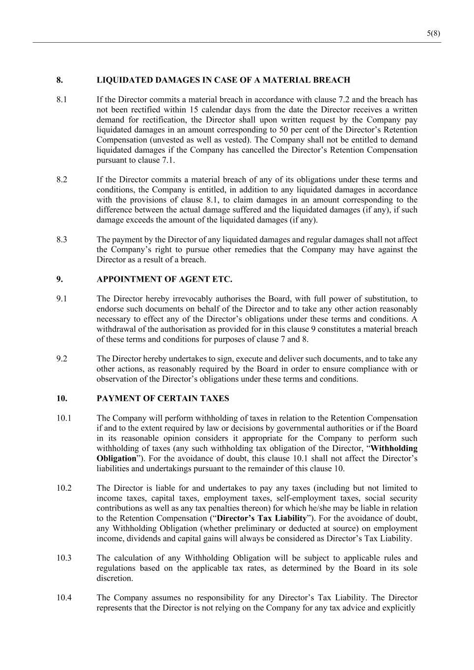 5(8) 8. LIQUIDATED DAMAGES IN CASE OF A MATERIAL BREACH 8.1 If the Director commits a material breach in accordance with clause 7.2 and the breach has not been rectified within 15 calendar days from the date the Director receives a written demand for rectification, the Director shall upon written request by the Company pay liquidated damages in an amount corresponding to 50 per cent of the Director’s Retention Compensation (unvested as well as vested). The Company shall not be entitled to demand liquidated damages if the Company has cancelled the Director’s Retention Compensation pursuant to clause 7.1. 8.2 If the Director commits a material breach of any of its obligations under these terms and conditions, the Company is entitled, in addition to any liquidated damages in accordance with the provisions of clause 8.1, to claim damages in an amount corresponding to the difference between the actual damage suffered and the liquidated damages (if any), if such damage exceeds the amount of the liquidated damages (if any). 8.3 The payment by the Director of any liquidated damages and regular damages shall not affect the Company’s right to pursue other remedies that the Company may have against the Director as a result of a breach. 9. APPOINTMENT OF AGENT ETC. 9.1 The Director hereby irrevocably authorises the Board, with full power of substitution, to endorse such documents on behalf of the Director and to take any other action reasonably necessary to effect any of the Director’s obligations under these terms and conditions. A withdrawal of the authorisation as provided for in this clause 9 constitutes a material breach of these terms and conditions for purposes of clause 7 and 8. 9.2 The Director hereby undertakes to sign, execute and deliver such documents, and to take any other actions, as reasonably required by the Board in order to ensure compliance with or observation of the Director’s obligations under these terms and conditions. 10. PAYMENT OF CERTAIN TAXES 10.1 The Company will perform withholding of taxes in relation to the Retention Compensation if and to the extent required by law or decisions by governmental authorities or if the Board in its reasonable opinion considers it appropriate for the Company to perform such withholding of taxes (any such withholding tax obligation of the Director, “Withholding Obligation”). For the avoidance of doubt, this clause 10.1 shall not affect the Director’s liabilities and undertakings pursuant to the remainder of this clause 10. 10.2 The Director is liable for and undertakes to pay any taxes (including but not limited to income taxes, capital taxes, employment taxes, self-employment taxes, social security contributions as well as any tax penalties thereon) for which he/she may be liable in relation to the Retention Compensation (“Director’s Tax Liability”). For the avoidance of doubt, any Withholding Obligation (whether preliminary or deducted at source) on employment income, dividends and capital gains will always be considered as Director’s Tax Liability. 10.3 The calculation of any Withholding Obligation will be subject to applicable rules and regulations based on the applicable tax rates, as determined by the Board in its sole discretion. 10.4 The Company assumes no responsibility for any Director’s Tax Liability. The Director represents that the Director is not relying on the Company for any tax advice and explicitly