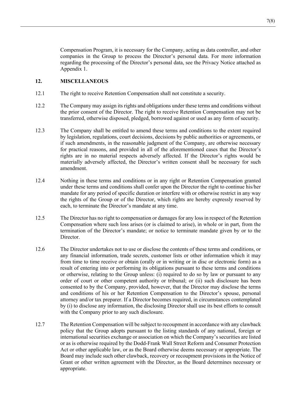 7(8) Compensation Program, it is necessary for the Company, acting as data controller, and other companies in the Group to process the Director’s personal data. For more information regarding the processing of the Director’s personal data, see the Privacy Notice attached as Appendix 1. 12. MISCELLANEOUS 12.1 The right to receive Retention Compensation shall not constitute a security. 12.2 The Company may assign its rights and obligations under these terms and conditions without the prior consent of the Director. The right to receive Retention Compensation may not be transferred, otherwise disposed, pledged, borrowed against or used as any form of security. 12.3 The Company shall be entitled to amend these terms and conditions to the extent required by legislation, regulations, court decisions, decisions by public authorities or agreements, or if such amendments, in the reasonable judgment of the Company, are otherwise necessary for practical reasons, and provided in all of the aforementioned cases that the Director’s rights are in no material respects adversely affected. If the Director’s rights would be materially adversely affected, the Director’s written consent shall be necessary for such amendment. 12.4 Nothing in these terms and conditions or in any right or Retention Compensation granted under these terms and conditions shall confer upon the Director the right to continue his/her mandate for any period of specific duration or interfere with or otherwise restrict in any way the rights of the Group or of the Director, which rights are hereby expressly reserved by each, to terminate the Director’s mandate at any time. 12.5 The Director has no right to compensation or damages for any loss in respect of the Retention Compensation where such loss arises (or is claimed to arise), in whole or in part, from the termination of the Director’s mandate; or notice to terminate mandate given by or to the Director. 12.6 The Director undertakes not to use or disclose the contents of these terms and conditions, or any financial information, trade secrets, customer lists or other information which it may from time to time receive or obtain (orally or in writing or in disc or electronic form) as a result of entering into or performing its obligations pursuant to these terms and conditions or otherwise, relating to the Group unless: (i) required to do so by law or pursuant to any order of court or other competent authority or tribunal; or (ii) such disclosure has been consented to by the Company, provided, however, that the Director may disclose the terms and conditions of his or her Retention Compensation to the Director’s spouse, personal attorney and/or tax preparer. If a Director becomes required, in circumstances contemplated by (i) to disclose any information, the disclosing Director shall use its best efforts to consult with the Company prior to any such disclosure. 12.7 The Retention Compensation will be subject to recoupment in accordance with any clawback policy that the Group adopts pursuant to the listing standards of any national, foreign or international securities exchange or association on which the Company’s securities are listed or as is otherwise required by the Dodd-Frank Wall Street Reform and Consumer Protection Act or other applicable law, or as the Board otherwise deems necessary or appropriate. The Board may include such other clawback, recovery or recoupment provisions in the Notice of Grant or other written agreement with the Director, as the Board determines necessary or appropriate.