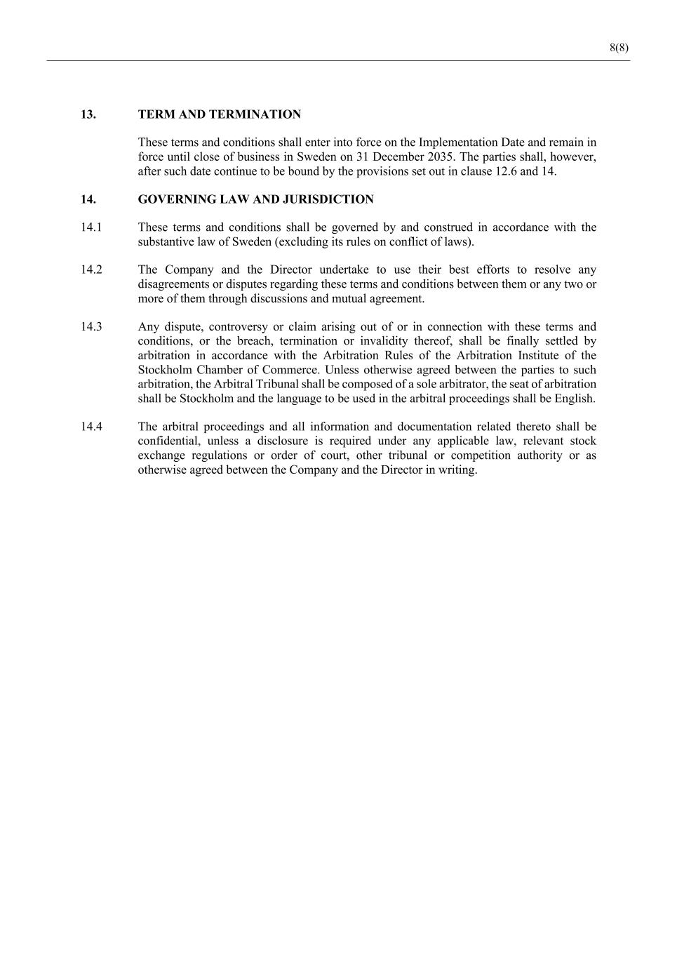 8(8) 13. TERM AND TERMINATION These terms and conditions shall enter into force on the Implementation Date and remain in force until close of business in Sweden on 31 December 2035. The parties shall, however, after such date continue to be bound by the provisions set out in clause 12.6 and 14. 14. GOVERNING LAW AND JURISDICTION 14.1 These terms and conditions shall be governed by and construed in accordance with the substantive law of Sweden (excluding its rules on conflict of laws). 14.2 The Company and the Director undertake to use their best efforts to resolve any disagreements or disputes regarding these terms and conditions between them or any two or more of them through discussions and mutual agreement. 14.3 Any dispute, controversy or claim arising out of or in connection with these terms and conditions, or the breach, termination or invalidity thereof, shall be finally settled by arbitration in accordance with the Arbitration Rules of the Arbitration Institute of the Stockholm Chamber of Commerce. Unless otherwise agreed between the parties to such arbitration, the Arbitral Tribunal shall be composed of a sole arbitrator, the seat of arbitration shall be Stockholm and the language to be used in the arbitral proceedings shall be English. 14.4 The arbitral proceedings and all information and documentation related thereto shall be confidential, unless a disclosure is required under any applicable law, relevant stock exchange regulations or order of court, other tribunal or competition authority or as otherwise agreed between the Company and the Director in writing.