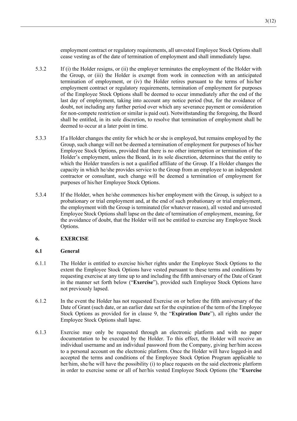 3(12) employment contract or regulatory requirements, all unvested Employee Stock Options shall cease vesting as of the date of termination of employment and shall immediately lapse. 5.3.2 If (i) the Holder resigns, or (ii) the employer terminates the employment of the Holder with the Group, or (iii) the Holder is exempt from work in connection with an anticipated termination of employment, or (iv) the Holder retires pursuant to the terms of his/her employment contract or regulatory requirements, termination of employment for purposes of the Employee Stock Options shall be deemed to occur immediately after the end of the last day of employment, taking into account any notice period (but, for the avoidance of doubt, not including any further period over which any severance payment or consideration for non-compete restriction or similar is paid out). Notwithstanding the foregoing, the Board shall be entitled, in its sole discretion, to resolve that termination of employment shall be deemed to occur at a later point in time. 5.3.3 If a Holder changes the entity for which he or she is employed, but remains employed by the Group, such change will not be deemed a termination of employment for purposes of his/her Employee Stock Options, provided that there is no other interruption or termination of the Holder’s employment, unless the Board, in its sole discretion, determines that the entity to which the Holder transfers is not a qualified affiliate of the Group. If a Holder changes the capacity in which he/she provides service to the Group from an employee to an independent contractor or consultant, such change will be deemed a termination of employment for purposes of his/her Employee Stock Options. 5.3.4 If the Holder, when he/she commences his/her employment with the Group, is subject to a probationary or trial employment and, at the end of such probationary or trial employment, the employment with the Group is terminated (for whatever reason), all vested and unvested Employee Stock Options shall lapse on the date of termination of employment, meaning, for the avoidance of doubt, that the Holder will not be entitled to exercise any Employee Stock Options. 6. EXERCISE 6.1 General 6.1.1 The Holder is entitled to exercise his/her rights under the Employee Stock Options to the extent the Employee Stock Options have vested pursuant to these terms and conditions by requesting exercise at any time up to and including the fifth anniversary of the Date of Grant in the manner set forth below (“Exercise”), provided such Employee Stock Options have not previously lapsed. 6.1.2 In the event the Holder has not requested Exercise on or before the fifth anniversary of the Date of Grant (such date, or an earlier date set for the expiration of the term of the Employee Stock Options as provided for in clause 9, the “Expiration Date”), all rights under the Employee Stock Options shall lapse. 6.1.3 Exercise may only be requested through an electronic platform and with no paper documentation to be executed by the Holder. To this effect, the Holder will receive an individual username and an individual password from the Company, giving her/him access to a personal account on the electronic platform. Once the Holder will have logged-in and accepted the terms and conditions of the Employee Stock Option Program applicable to her/him, she/he will have the possibility (i) to place requests on the said electronic platform in order to exercise some or all of her/his vested Employee Stock Options (the “Exercise