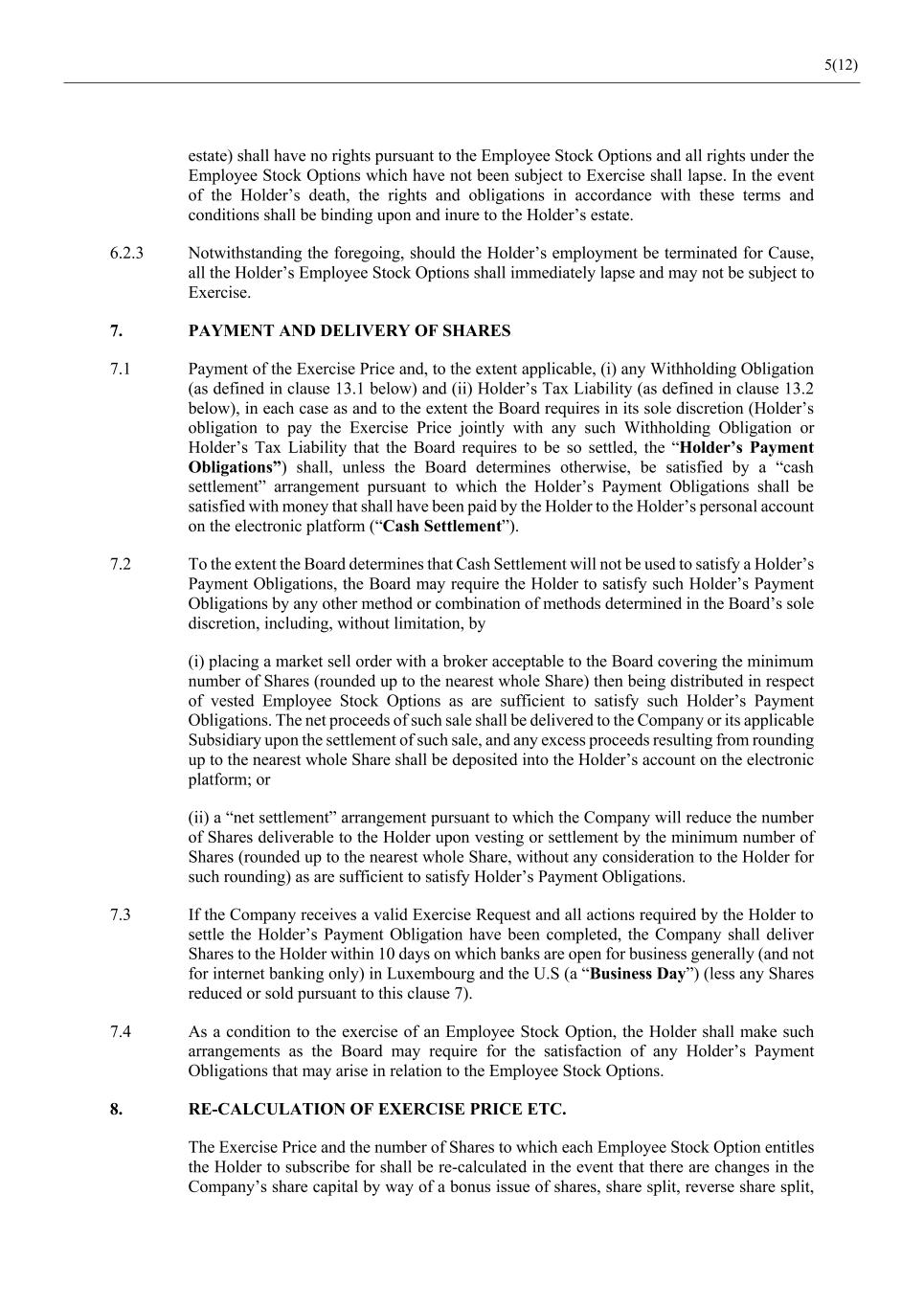5(12) estate) shall have no rights pursuant to the Employee Stock Options and all rights under the Employee Stock Options which have not been subject to Exercise shall lapse. In the event of the Holder’s death, the rights and obligations in accordance with these terms and conditions shall be binding upon and inure to the Holder’s estate. 6.2.3 Notwithstanding the foregoing, should the Holder’s employment be terminated for Cause, all the Holder’s Employee Stock Options shall immediately lapse and may not be subject to Exercise. 7. PAYMENT AND DELIVERY OF SHARES 7.1 Payment of the Exercise Price and, to the extent applicable, (i) any Withholding Obligation (as defined in clause 13.1 below) and (ii) Holder’s Tax Liability (as defined in clause 13.2 below), in each case as and to the extent the Board requires in its sole discretion (Holder’s obligation to pay the Exercise Price jointly with any such Withholding Obligation or Holder’s Tax Liability that the Board requires to be so settled, the “Holder’s Payment Obligations”) shall, unless the Board determines otherwise, be satisfied by a “cash settlement” arrangement pursuant to which the Holder’s Payment Obligations shall be satisfied with money that shall have been paid by the Holder to the Holder’s personal account on the electronic platform (“Cash Settlement”). 7.2 To the extent the Board determines that Cash Settlement will not be used to satisfy a Holder’s Payment Obligations, the Board may require the Holder to satisfy such Holder’s Payment Obligations by any other method or combination of methods determined in the Board’s sole discretion, including, without limitation, by (i) placing a market sell order with a broker acceptable to the Board covering the minimum number of Shares (rounded up to the nearest whole Share) then being distributed in respect of vested Employee Stock Options as are sufficient to satisfy such Holder’s Payment Obligations. The net proceeds of such sale shall be delivered to the Company or its applicable Subsidiary upon the settlement of such sale, and any excess proceeds resulting from rounding up to the nearest whole Share shall be deposited into the Holder’s account on the electronic platform; or (ii) a “net settlement” arrangement pursuant to which the Company will reduce the number of Shares deliverable to the Holder upon vesting or settlement by the minimum number of Shares (rounded up to the nearest whole Share, without any consideration to the Holder for such rounding) as are sufficient to satisfy Holder’s Payment Obligations. 7.3 If the Company receives a valid Exercise Request and all actions required by the Holder to settle the Holder’s Payment Obligation have been completed, the Company shall deliver Shares to the Holder within 10 days on which banks are open for business generally (and not for internet banking only) in Luxembourg and the U.S (a “Business Day”) (less any Shares reduced or sold pursuant to this clause 7). 7.4 As a condition to the exercise of an Employee Stock Option, the Holder shall make such arrangements as the Board may require for the satisfaction of any Holder’s Payment Obligations that may arise in relation to the Employee Stock Options. 8. RE-CALCULATION OF EXERCISE PRICE ETC. The Exercise Price and the number of Shares to which each Employee Stock Option entitles the Holder to subscribe for shall be re-calculated in the event that there are changes in the Company’s share capital by way of a bonus issue of shares, share split, reverse share split,