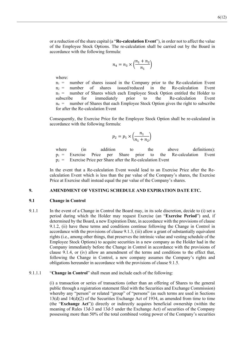 6(12) or a reduction of the share capital (a “Re-calculation Event”), in order not to affect the value of the Employee Stock Options. The re-calculation shall be carried out by the Board in accordance with the following formula: 𝑛! = 𝑛" × $ 𝑛# + 𝑛$ 𝑛# & where: n1 = number of shares issued in the Company prior to the Re-calculation Event n2 = number of shares issued/reduced in the Re-calculation Event n3 = number of Shares which each Employee Stock Option entitled the Holder to subscribe for immediately prior to the Re-calculation Event n4 = number of Shares that each Employee Stock Option gives the right to subscribe for after the Re-calculation Event Consequently, the Exercise Price for the Employee Stock Option shall be re-calculated in accordance with the following formula: 𝑝$ = 𝑝# × $ 𝑛# 𝑛# + 𝑛$ & where (in addition to the above definitions): p1 = Exercise Price per Share prior to the Re-calculation Event p2 = Exercise Price per Share after the Re-calculation Event In the event that a Re-calculation Event would lead to an Exercise Price after the Re- calculation Event which is less than the par value of the Company’s shares, the Exercise Price at Exercise shall instead equal the par value of the Company’s shares. 9. AMENDMENT OF VESTING SCHEDULE AND EXPIRATION DATE ETC. 9.1 Change in Control 9.1.1 In the event of a Change in Control the Board may, in its sole discretion, decide to (i) set a period during which the Holder may request Exercise (an “Exercise Period”) and, if determined by the Board, a new Expiration Date, in accordance with the provisions of clause 9.1.2, (ii) have these terms and conditions continue following the Change in Control in accordance with the provisions of clause 9.1.3, (iii) allow a grant of substantially equivalent rights (i.e., among other things, that preserves the intrinsic value and vesting schedule of the Employee Stock Options) to acquire securities in a new company as the Holder had in the Company immediately before the Change in Control in accordance with the provisions of clause 9.1.4, or (iv) allow an amendment of the terms and conditions to the effect that, following the Change in Control, a new company assumes the Company’s rights and obligations hereunder in accordance with the provisions of clause 9.1.5. 9.1.1.1 “Change in Control” shall mean and include each of the following: (i) a transaction or series of transactions (other than an offering of Shares to the general public through a registration statement filed with the Securities and Exchange Commission) whereby any “person” or related “group” of “persons” (as such terms are used in Sections 13(d) and 14(d)(2) of the Securities Exchange Act of 1934, as amended from time to time (the “Exchange Act”)) directly or indirectly acquires beneficial ownership (within the meaning of Rules 13d-3 and 13d-5 under the Exchange Act) of securities of the Company possessing more than 50% of the total combined voting power of the Company’s securities