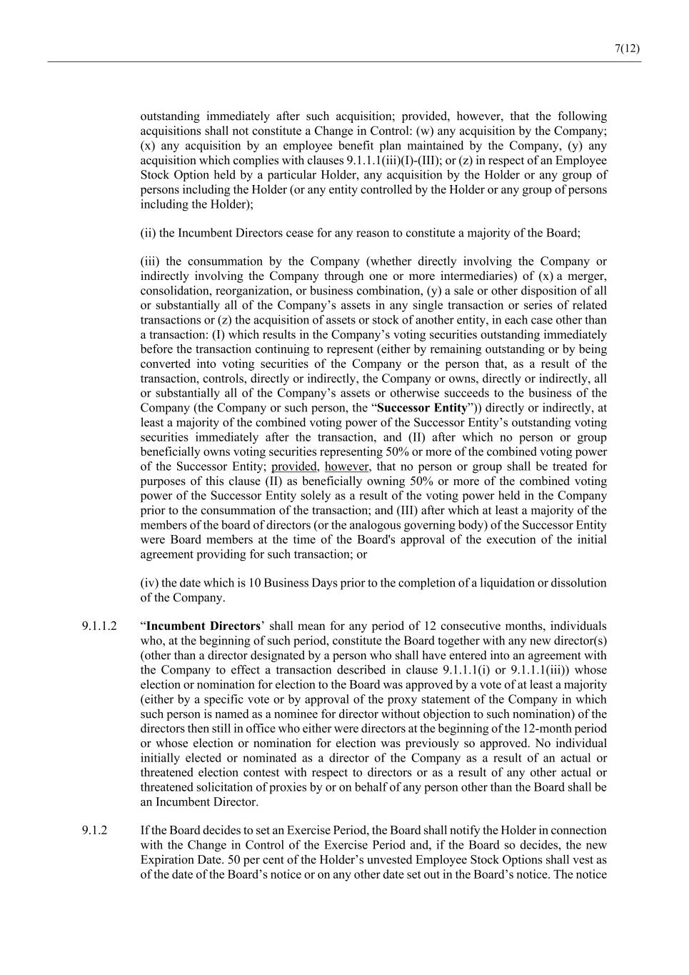 7(12) outstanding immediately after such acquisition; provided, however, that the following acquisitions shall not constitute a Change in Control: (w) any acquisition by the Company; (x) any acquisition by an employee benefit plan maintained by the Company, (y) any acquisition which complies with clauses 9.1.1.1(iii)(I)-(III); or (z) in respect of an Employee Stock Option held by a particular Holder, any acquisition by the Holder or any group of persons including the Holder (or any entity controlled by the Holder or any group of persons including the Holder); (ii) the Incumbent Directors cease for any reason to constitute a majority of the Board; (iii) the consummation by the Company (whether directly involving the Company or indirectly involving the Company through one or more intermediaries) of (x) a merger, consolidation, reorganization, or business combination, (y) a sale or other disposition of all or substantially all of the Company’s assets in any single transaction or series of related transactions or (z) the acquisition of assets or stock of another entity, in each case other than a transaction: (I) which results in the Company’s voting securities outstanding immediately before the transaction continuing to represent (either by remaining outstanding or by being converted into voting securities of the Company or the person that, as a result of the transaction, controls, directly or indirectly, the Company or owns, directly or indirectly, all or substantially all of the Company’s assets or otherwise succeeds to the business of the Company (the Company or such person, the “Successor Entity”)) directly or indirectly, at least a majority of the combined voting power of the Successor Entity’s outstanding voting securities immediately after the transaction, and (II) after which no person or group beneficially owns voting securities representing 50% or more of the combined voting power of the Successor Entity; provided, however, that no person or group shall be treated for purposes of this clause (II) as beneficially owning 50% or more of the combined voting power of the Successor Entity solely as a result of the voting power held in the Company prior to the consummation of the transaction; and (III) after which at least a majority of the members of the board of directors (or the analogous governing body) of the Successor Entity were Board members at the time of the Board's approval of the execution of the initial agreement providing for such transaction; or (iv) the date which is 10 Business Days prior to the completion of a liquidation or dissolution of the Company. 9.1.1.2 “Incumbent Directors’ shall mean for any period of 12 consecutive months, individuals who, at the beginning of such period, constitute the Board together with any new director(s) (other than a director designated by a person who shall have entered into an agreement with the Company to effect a transaction described in clause 9.1.1.1(i) or 9.1.1.1(iii)) whose election or nomination for election to the Board was approved by a vote of at least a majority (either by a specific vote or by approval of the proxy statement of the Company in which such person is named as a nominee for director without objection to such nomination) of the directors then still in office who either were directors at the beginning of the 12-month period or whose election or nomination for election was previously so approved. No individual initially elected or nominated as a director of the Company as a result of an actual or threatened election contest with respect to directors or as a result of any other actual or threatened solicitation of proxies by or on behalf of any person other than the Board shall be an Incumbent Director. 9.1.2 If the Board decides to set an Exercise Period, the Board shall notify the Holder in connection with the Change in Control of the Exercise Period and, if the Board so decides, the new Expiration Date. 50 per cent of the Holder’s unvested Employee Stock Options shall vest as of the date of the Board’s notice or on any other date set out in the Board’s notice. The notice