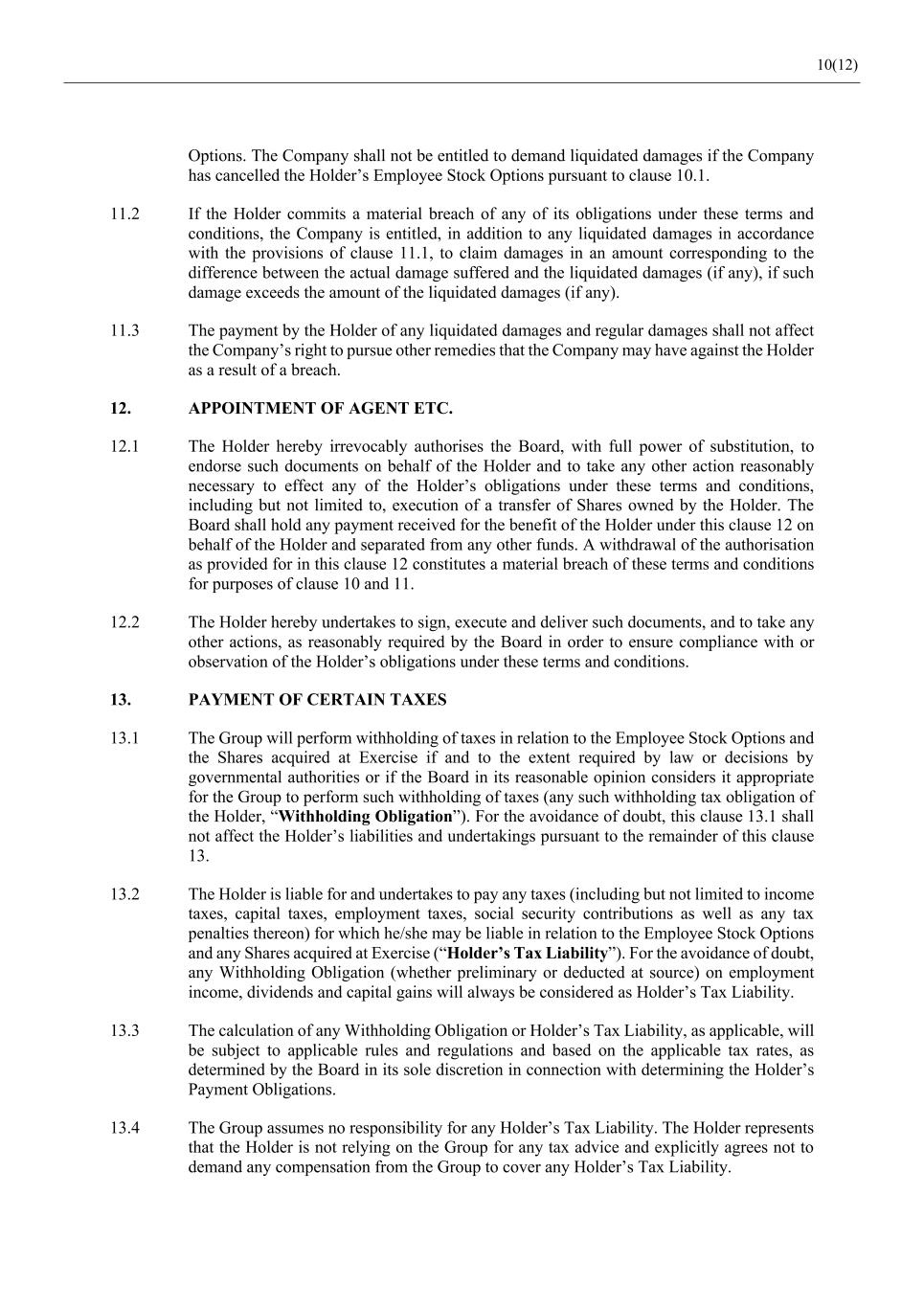10(12) Options. The Company shall not be entitled to demand liquidated damages if the Company has cancelled the Holder’s Employee Stock Options pursuant to clause 10.1. 11.2 If the Holder commits a material breach of any of its obligations under these terms and conditions, the Company is entitled, in addition to any liquidated damages in accordance with the provisions of clause 11.1, to claim damages in an amount corresponding to the difference between the actual damage suffered and the liquidated damages (if any), if such damage exceeds the amount of the liquidated damages (if any). 11.3 The payment by the Holder of any liquidated damages and regular damages shall not affect the Company’s right to pursue other remedies that the Company may have against the Holder as a result of a breach. 12. APPOINTMENT OF AGENT ETC. 12.1 The Holder hereby irrevocably authorises the Board, with full power of substitution, to endorse such documents on behalf of the Holder and to take any other action reasonably necessary to effect any of the Holder’s obligations under these terms and conditions, including but not limited to, execution of a transfer of Shares owned by the Holder. The Board shall hold any payment received for the benefit of the Holder under this clause 12 on behalf of the Holder and separated from any other funds. A withdrawal of the authorisation as provided for in this clause 12 constitutes a material breach of these terms and conditions for purposes of clause 10 and 11. 12.2 The Holder hereby undertakes to sign, execute and deliver such documents, and to take any other actions, as reasonably required by the Board in order to ensure compliance with or observation of the Holder’s obligations under these terms and conditions. 13. PAYMENT OF CERTAIN TAXES 13.1 The Group will perform withholding of taxes in relation to the Employee Stock Options and the Shares acquired at Exercise if and to the extent required by law or decisions by governmental authorities or if the Board in its reasonable opinion considers it appropriate for the Group to perform such withholding of taxes (any such withholding tax obligation of the Holder, “Withholding Obligation”). For the avoidance of doubt, this clause 13.1 shall not affect the Holder’s liabilities and undertakings pursuant to the remainder of this clause 13. 13.2 The Holder is liable for and undertakes to pay any taxes (including but not limited to income taxes, capital taxes, employment taxes, social security contributions as well as any tax penalties thereon) for which he/she may be liable in relation to the Employee Stock Options and any Shares acquired at Exercise (“Holder’s Tax Liability”). For the avoidance of doubt, any Withholding Obligation (whether preliminary or deducted at source) on employment income, dividends and capital gains will always be considered as Holder’s Tax Liability. 13.3 The calculation of any Withholding Obligation or Holder’s Tax Liability, as applicable, will be subject to applicable rules and regulations and based on the applicable tax rates, as determined by the Board in its sole discretion in connection with determining the Holder’s Payment Obligations. 13.4 The Group assumes no responsibility for any Holder’s Tax Liability. The Holder represents that the Holder is not relying on the Group for any tax advice and explicitly agrees not to demand any compensation from the Group to cover any Holder’s Tax Liability.