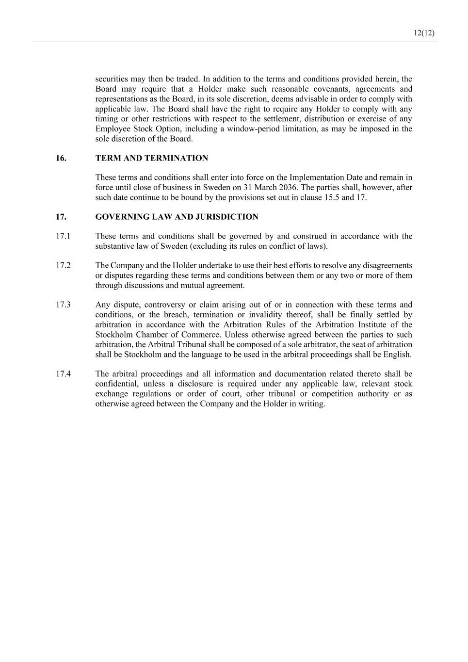 12(12) securities may then be traded. In addition to the terms and conditions provided herein, the Board may require that a Holder make such reasonable covenants, agreements and representations as the Board, in its sole discretion, deems advisable in order to comply with applicable law. The Board shall have the right to require any Holder to comply with any timing or other restrictions with respect to the settlement, distribution or exercise of any Employee Stock Option, including a window-period limitation, as may be imposed in the sole discretion of the Board. 16. TERM AND TERMINATION These terms and conditions shall enter into force on the Implementation Date and remain in force until close of business in Sweden on 31 March 2036. The parties shall, however, after such date continue to be bound by the provisions set out in clause 15.5 and 17. 17. GOVERNING LAW AND JURISDICTION 17.1 These terms and conditions shall be governed by and construed in accordance with the substantive law of Sweden (excluding its rules on conflict of laws). 17.2 The Company and the Holder undertake to use their best efforts to resolve any disagreements or disputes regarding these terms and conditions between them or any two or more of them through discussions and mutual agreement. 17.3 Any dispute, controversy or claim arising out of or in connection with these terms and conditions, or the breach, termination or invalidity thereof, shall be finally settled by arbitration in accordance with the Arbitration Rules of the Arbitration Institute of the Stockholm Chamber of Commerce. Unless otherwise agreed between the parties to such arbitration, the Arbitral Tribunal shall be composed of a sole arbitrator, the seat of arbitration shall be Stockholm and the language to be used in the arbitral proceedings shall be English. 17.4 The arbitral proceedings and all information and documentation related thereto shall be confidential, unless a disclosure is required under any applicable law, relevant stock exchange regulations or order of court, other tribunal or competition authority or as otherwise agreed between the Company and the Holder in writing.
