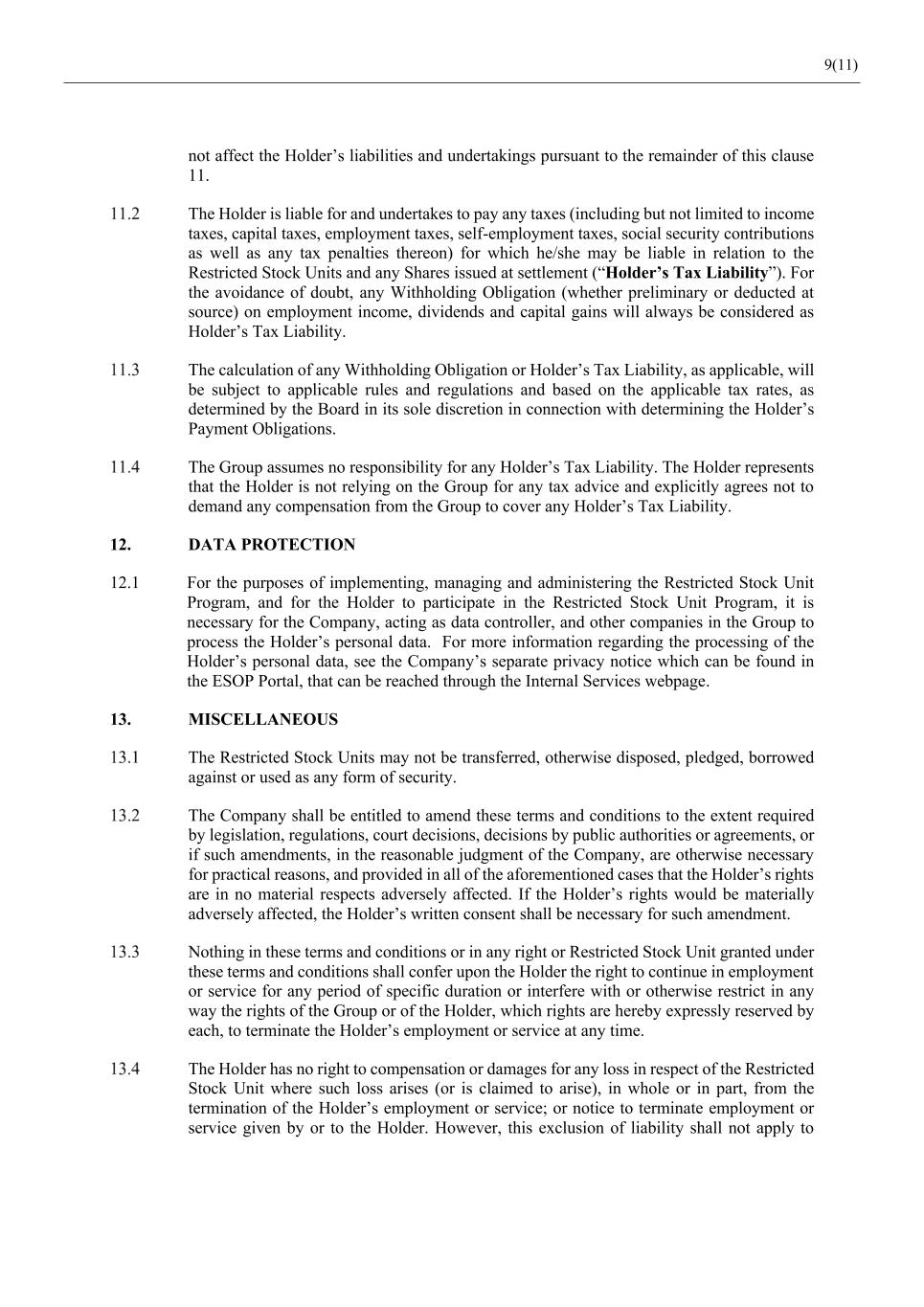 9(11) not affect the Holder’s liabilities and undertakings pursuant to the remainder of this clause 11. The Holder is liable for and undertakes to pay any taxes (including but not limited to income taxes, capital taxes, employment taxes, self-employment taxes, social security contributions as well as any tax penalties thereon) for which he/she may be liable in relation to the Restricted Stock Units and any Shares issued at settlement (“Holder’s Tax Liability”). For the avoidance of doubt, any Withholding Obligation (whether preliminary or deducted at source) on employment income, dividends and capital gains will always be considered as Holder’s Tax Liability. The calculation of any Withholding Obligation or Holder’s Tax Liability, as applicable, will be subject to applicable rules and regulations and based on the applicable tax rates, as determined by the Board in its sole discretion in connection with determining the Holder’s Payment Obligations. The Group assumes no responsibility for any Holder’s Tax Liability. The Holder represents that the Holder is not relying on the Group for any tax advice and explicitly agrees not to demand any compensation from the Group to cover any Holder’s Tax Liability. 12. DATA PROTECTION 12.1 For the purposes of implementing, managing and administering the Restricted Stock Unit Program, and for the Holder to participate in the Restricted Stock Unit Program, it is necessary for the Company, acting as data controller, and other companies in the Group to process the Holder’s personal data. For more information regarding the processing of the Holder’s personal data, see the Company’s separate privacy notice which can be found in the ESOP Portal, that can be reached through the Internal Services webpage. 13. MISCELLANEOUS The Restricted Stock Units may not be transferred, otherwise disposed, pledged, borrowed against or used as any form of security. The Company shall be entitled to amend these terms and conditions to the extent required by legislation, regulations, court decisions, decisions by public authorities or agreements, or if such amendments, in the reasonable judgment of the Company, are otherwise necessary for practical reasons, and provided in all of the aforementioned cases that the Holder’s rights are in no material respects adversely affected. If the Holder’s rights would be materially adversely affected, the Holder’s written consent shall be necessary for such amendment. Nothing in these terms and conditions or in any right or Restricted Stock Unit granted under these terms and conditions shall confer upon the Holder the right to continue in employment or service for any period of specific duration or interfere with or otherwise restrict in any way the rights of the Group or of the Holder, which rights are hereby expressly reserved by each, to terminate the Holder’s employment or service at any time. The Holder has no right to compensation or damages for any loss in respect of the Restricted Stock Unit where such loss arises (or is claimed to arise), in whole or in part, from the termination of the Holder’s employment or service; or notice to terminate employment or service given by or to the Holder. However, this exclusion of liability shall not apply to