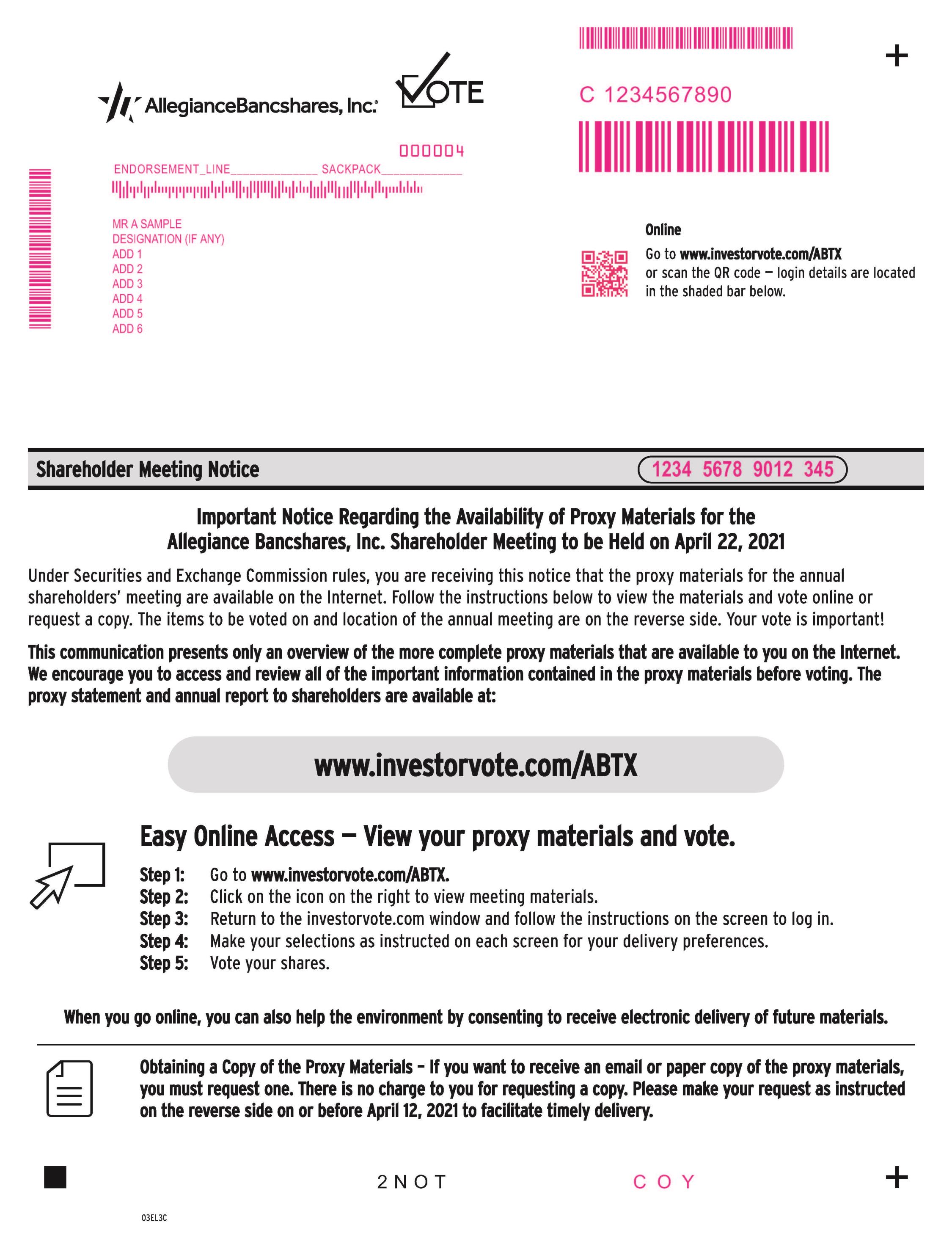 MMMMMMMMMMMM + C 1234567890 000004 MMMMMMM ENDORSEMENT_LINE______________ SACKPACK_____________ MMMMMMMMM MR A SAMPLE Online DESIGNATION (IF ANY) ADD 1 Go to www.investorvote.com/ABTX ADD 2 or scan the QR code — login details are located ADD 3 in the shaded bar below. ADD 4 ADD 5 ADD 6 Shareholder Meeting Notice 1234 5678 9012 345 Important Notice Regarding the Availability of Proxy Materials for the Allegiance Bancshares, Inc. Shareholder Meeting to be Held on April 22, 2021 Under Securities and Exchange Commission rules, you are receiving this notice that the proxy materials for the annual shareholders’ meeting are available on the Internet. Follow the instructions below to view the materials and vote online or request a copy. The items to be voted on and location of the annual meeting are on the reverse side. Your vote is important! This communication presents only an overview of the more complete proxy materials that are available to you on the Internet. We encourage you to access and review all of the important information contained in the proxy materials before voting. The proxy statement and annual report to shareholders are available at: www.investorvote.com/ABTX Easy Online Access — View your proxy materials and vote. Step 1: Go to www.investorvote.com/ABTX. Step 2: Click on the icon on the right to view meeting materials. Step 3: Return to the investorvote.com window and follow the instructions on the screen to log in. Step 4: Make your selections as instructed on each screen for your delivery preferences. Step 5: Vote your shares. When you go online, you can also help the environment by consenting to receive electronic delivery of future materials. Obtaining a Copy of the Proxy Materials – If you want to receive an email or paper copy of the proxy materials, you must request one. There is no charge to you for requesting a copy. Please make your request as instructed on the reverse side on or before April 12, 2021 to facilitate timely delivery. 2NOT COY + 03EL3C