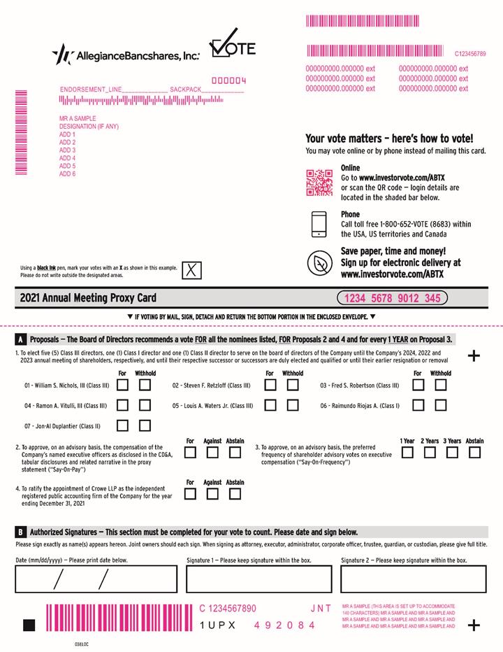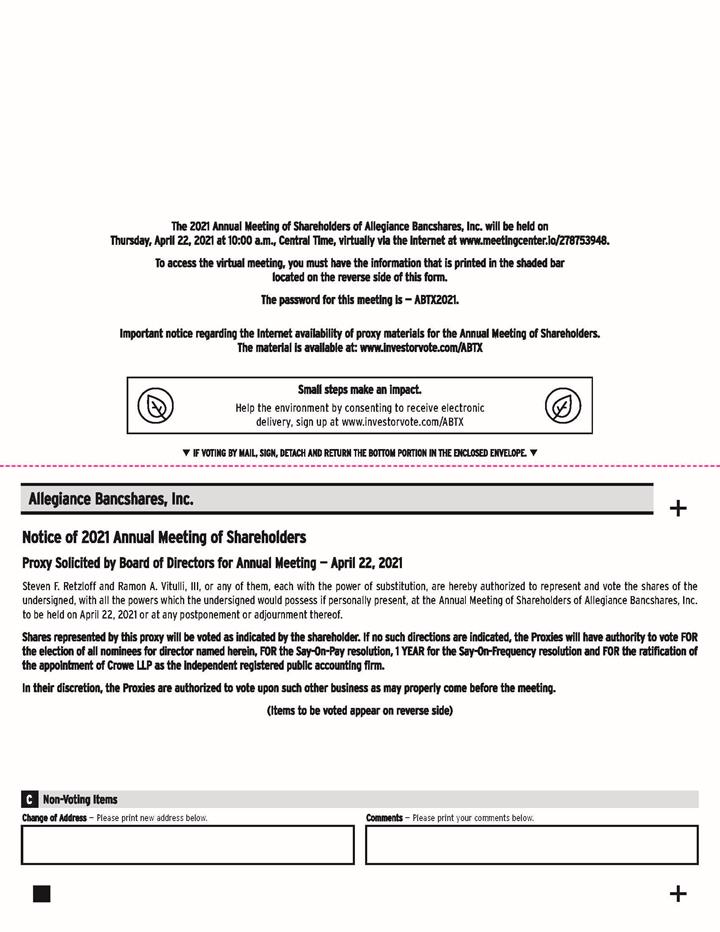 The 2021 Annual Meeting of Shareholders of Allegiance Bancshares, Inc. will be held on Thursday, April 22, 2021 at 10:00 a.m., Central Time, virtually via the internet at www.meetingcenter.io/278753948. To access the virtual meeting, you must have the information that is printed in the shaded bar located on the reverse side of this form. The password for this meeting is — ABTX2021. Important notice regarding the Internet availability of proxy materials for the Annual Meeting of Shareholders. The material is available at: www.investorvote.com/ABTX Small steps make an impact. Help the environment by consenting to receive electronic delivery, sign up at www.investorvote.com/ABTX • IF VOTING BY MAIL, SIGN, DETACH AND RETURN THE BOTTOM PORTION IN THE ENCLOSED ENVELOPE. • Allegiance Bancshares, Inc. + Notice of 2021 Annual Meeting of Shareholders Proxy Solicited by Board of Directors for Annual Meeting — April 22, 2021 Steven F. Retzloff and Ramon A. Vitulli, III, or any of them, each with the power of substitution, are hereby authorized to represent and vote the shares of the undersigned, with all the powers which the undersigned would possess if personally present, at the Annual Meeting of Shareholders of Allegiance Bancshares, Inc. to be held on April 22, 2021 or at any postponement or adjournment thereof. Shares represented by this proxy will be voted as indicated by the shareholder. If no such directions are indicated, the Proxies will have authority to vote FOR the election of all nominees for director named herein, FOR the Say-On-Pay resolution, 1 YEAR for the Say-On-Frequency resolution and FOR the ratification of the appointment of Crowe LLP as the independent registered public accounting firm. In their discretion, the Proxies are authorized to vote upon such other business as may properly come before the meeting. (Items to be voted appear on reverse side) Non-Voting Items C Change of Address — Please print new address below. Comments — Please print your comments below. +