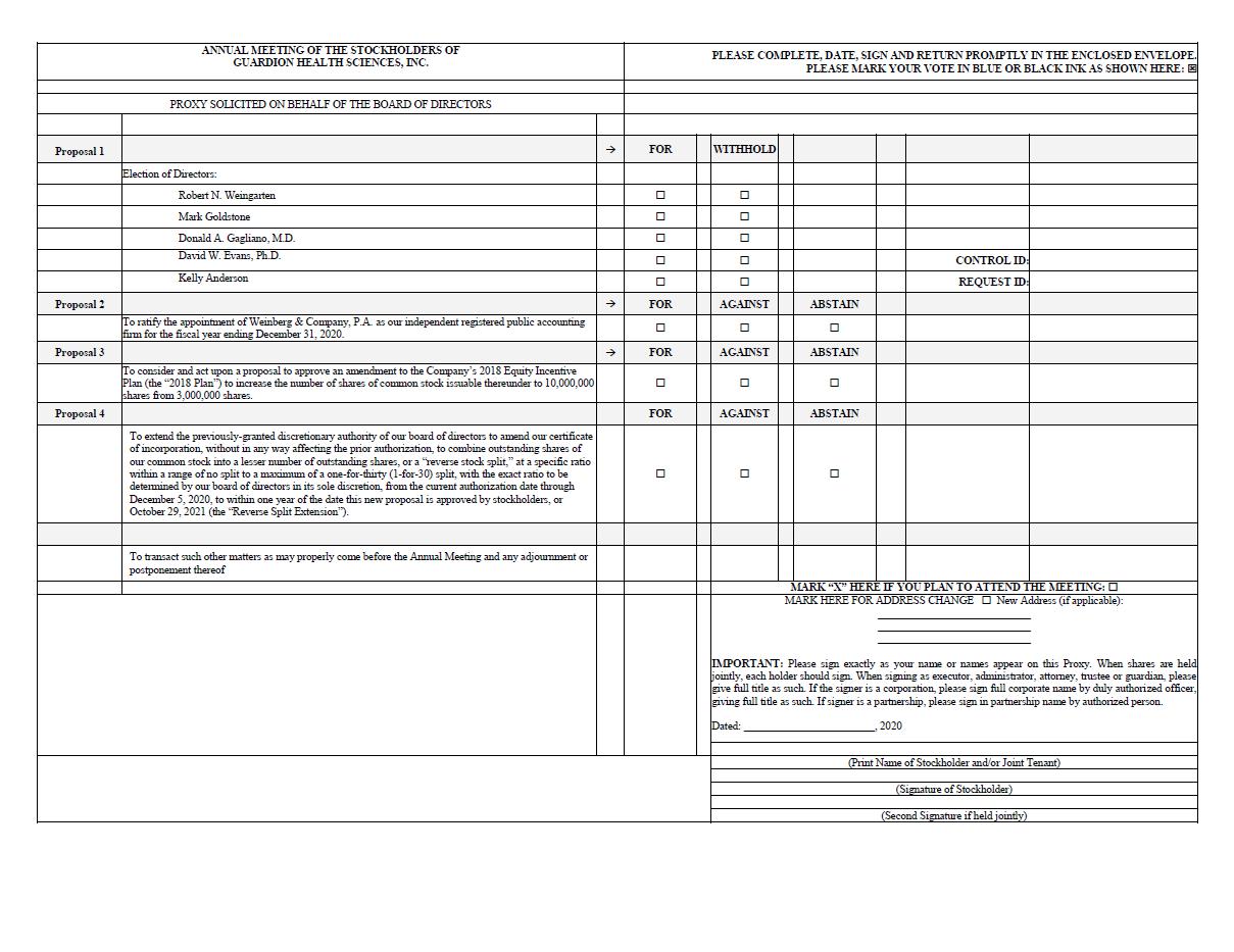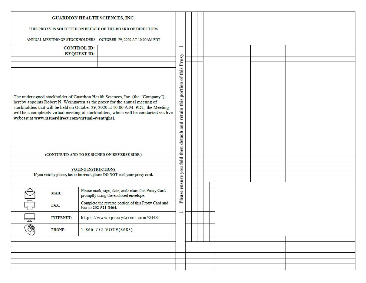 The board of directors of Guardion Health Sciences, Inc. (“Guardion” or the “Company”) is soliciting your proxy to vote at the Annual Meeting of Stockholders (the “Annual Meeting”) to be held on October 29, 2020, at 10:00 a.m. Pacific Time, in a virtual format online by accessing https://www.issuerdirect.com/virtual-event/ghsi and at any adjournment thereof.