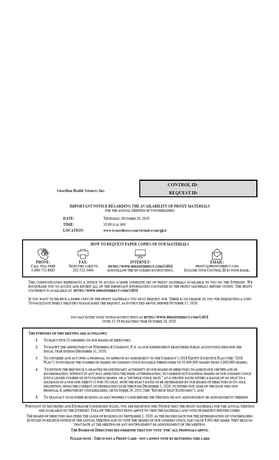 We are pleased to invite you to attend the annual meeting of stockholders (the “Annual Meeting”) of Guardion Health Sciences, Inc. (the “Company”), which will be held on October 29, 2020 at 10:00 a.m. Pacific Time.
