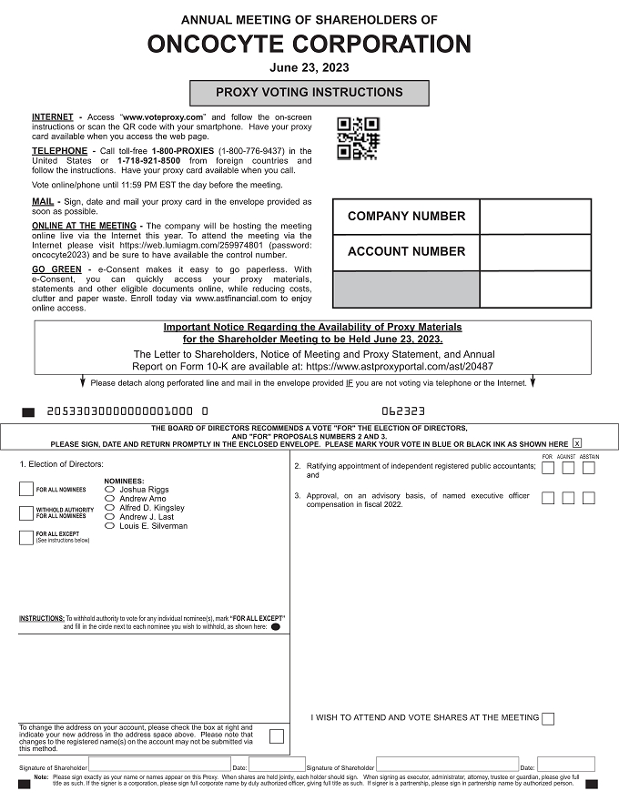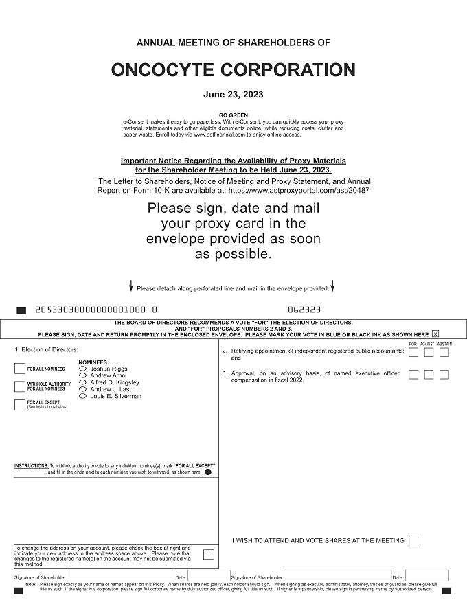 You are cordially invited to attend the Annual Meeting of Shareholders of Oncocyte Corporation which will be held virtually on Friday, June 23, 2023, at 10:00 a.m. Pacific Time online through https://web.lumiagm.com/259974801.