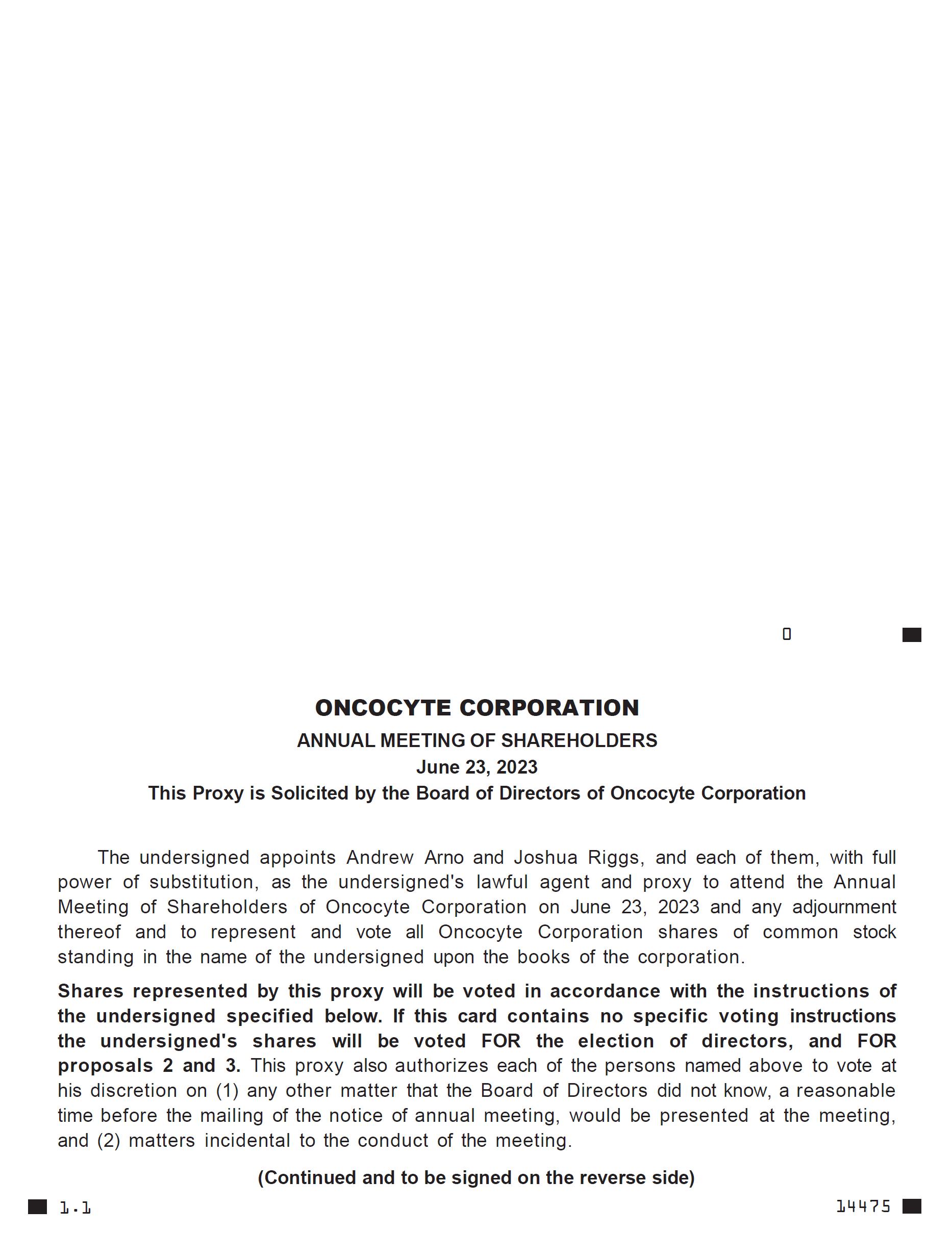 The Notice and Proxy Statement on the following pages contain details concerning the business to come before the meeting and instructions on how to gain admission to the Annual Meeting online. Management will report on current operations, and there will be an opportunity for discussion concerning Oncocyte and its activities. Please sign and return your proxy card in the enclosed envelope to ensure that your shares will be represented and voted at the virtual meeting even if you cannot attend. You are urged to sign and return the enclosed proxy card even if you plan to attend the virtual meeting.