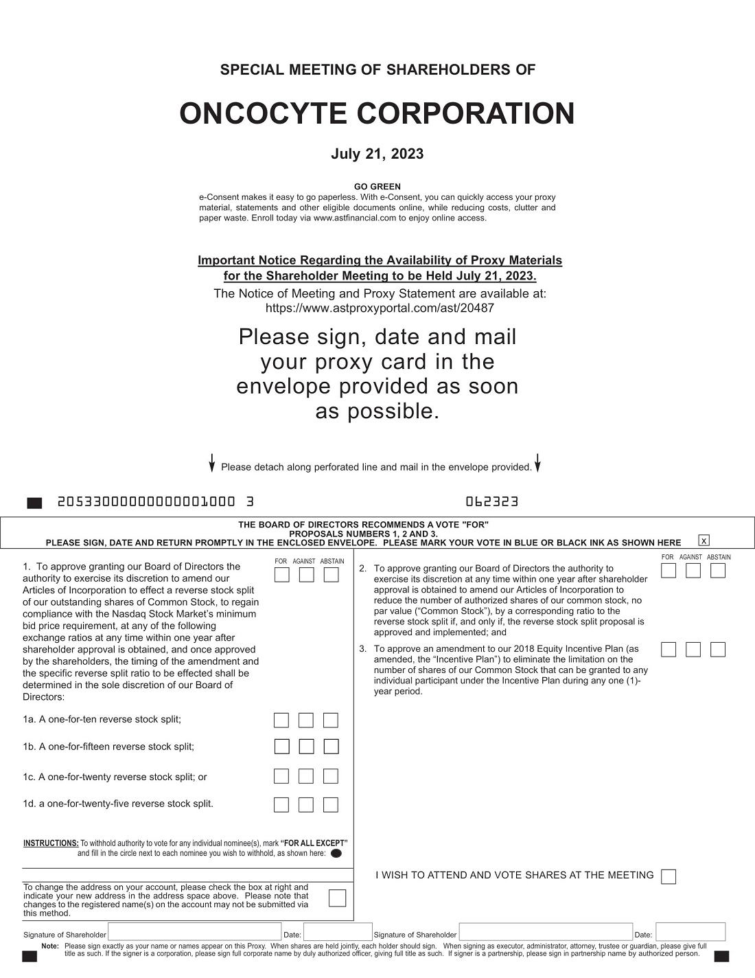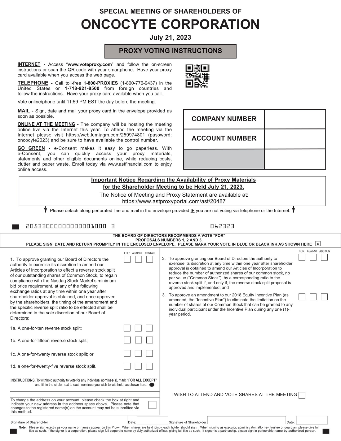 You will receive a confirmation of your registration by email after we receive your registration materials. You may attend the Meeting and vote your shares at https://web.lumiagm.com/259974801 during the Meeting. The password for the meeting is oncocyte2023. Follow the instructions provided to vote. We encourage you to access the Meeting prior to the start time leaving ample time for the check in.