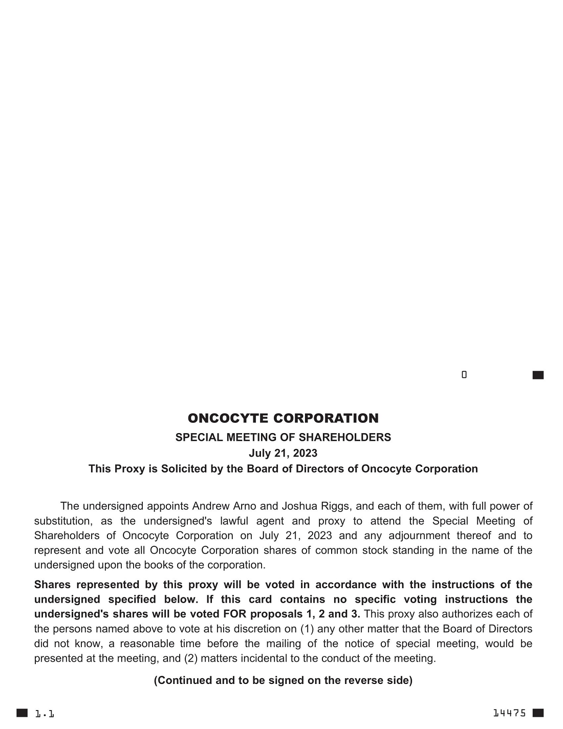 The accompanying proxy is solicited by the Board of Directors of Oncocyte Corporation (the “Company”), a California corporation, for use at the Special Meeting of Shareholders to be held virtually via an online electronic video screen communication.