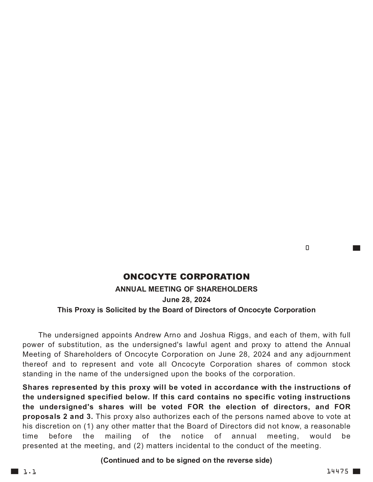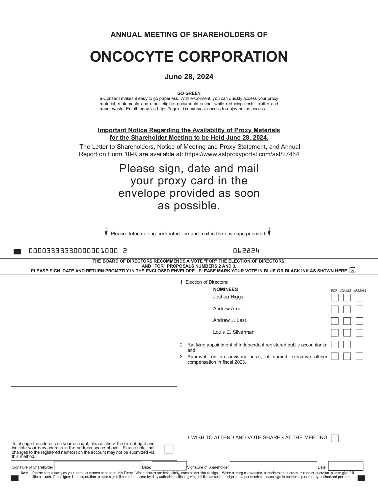 You are cordially invited to attend the 2024 Annual Meeting of Shareholders (the “Meeting) of Oncocyte Corporation (“Oncocyte”) which will be held virtually on Friday, June 28, 2024, at 10:00 a.m. Pacific Time online through https://web.lumiconnect.com/259974801.