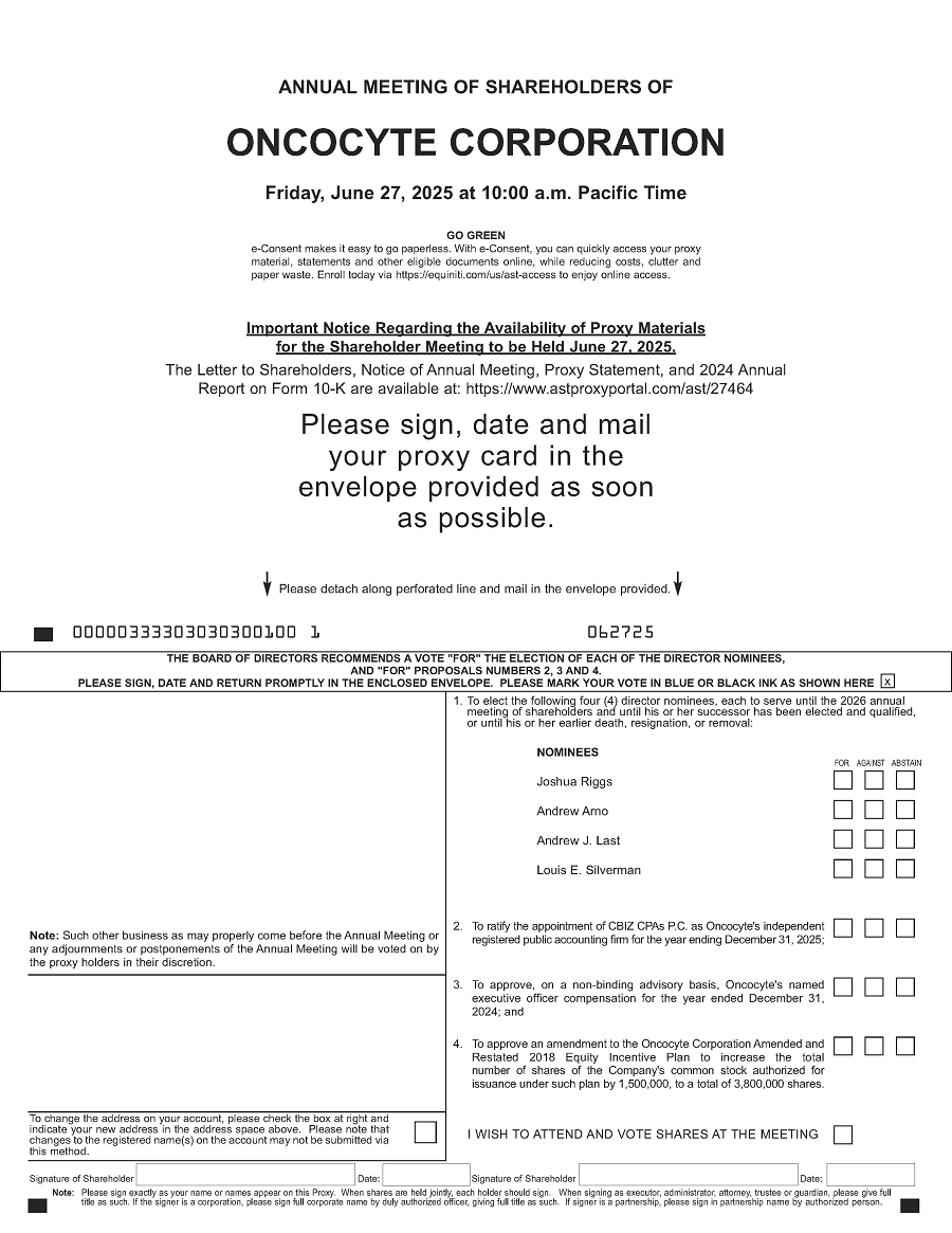 You are cordially invited to attend the 2025 Annual Meeting of Shareholders (the “Annual Meeting”) of Oncocyte Corporation, a California corporation (“Oncocyte”) which will be held virtually on Friday, June 27, 2025, at 10:00 a.m. Pacific Time online through https://web.lumiconnect.com/259974801.