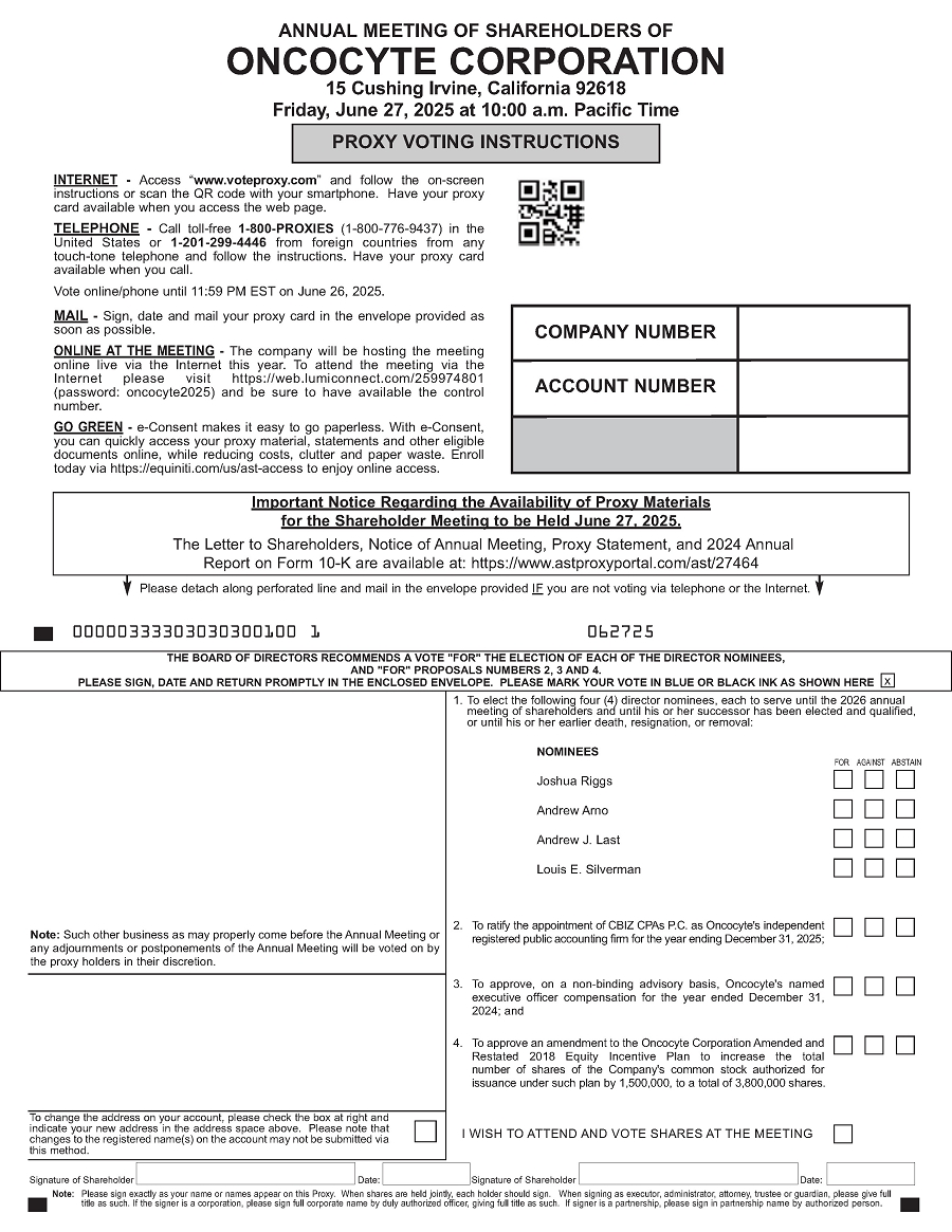 Beginning on or around May 16, 2025, we will send a Notice Regarding the Availability of Proxy Materials to all shareholders entitled to vote at the Annual Meeting, together with instructions on how to access our proxy materials over the internet and how to vote. The Notice of Internet Availability is not a proxy card and cannot be used to vote your shares. If you received this Notice and would prefer to receive paper copies of the proxy materials at no charge, you may notify us at info@oncocyte.com or (949) 409-7600.