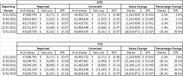 The statement in question refers to the distinction between the primary financial statements (i.e., the aggregate dollar income statement) and the per-share earnings information presented at the bottom therein. The primary financial statements showed no change in our reported net loss figure as a result of the error. The impact of the error in question was isolated to only EPS, which is considered a “secondary presentation” in the context of our financial reporting – appearing below the aggregate dollar income statement information. This means that while EPS is a critical measure “of assessing a company’s performance on a per-share basis, the error did not alter the fundamental financial results of the Company that had a significant loss in 2021 and has had a history of significant losses in the recent past.