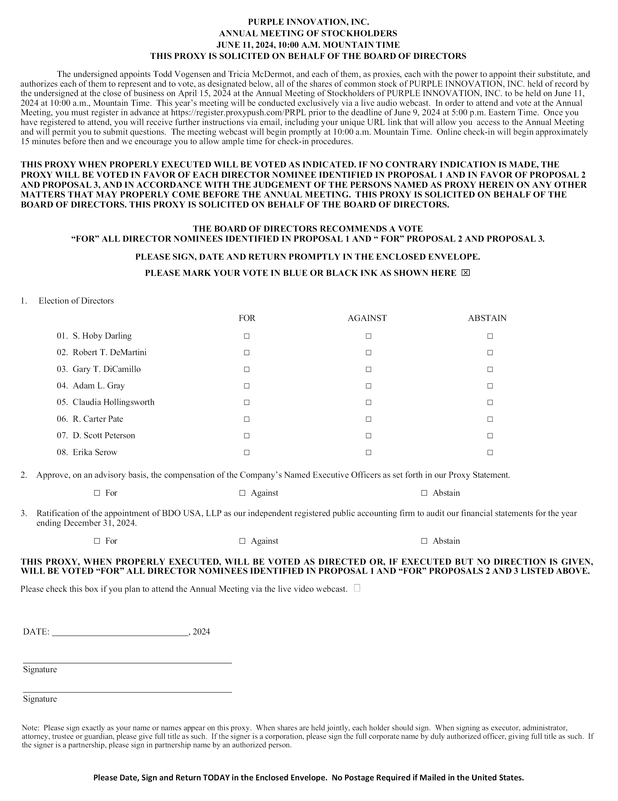 PURPLE INNOVATION, INC. ANNUAL MEETING OF STOCKHOLDERS JUNE 11, 2024, 10:00 A.M. MOUNTAIN TIME THIS PROXY IS SOLICITED ON BEHALF OF THE BOARD OF DIRECTORS The undersigned appoints Todd Vogensen and Tricia McDermot, and each of them, as proxies, each with the power to appoint their substitute, and authorizes each of them to represent and to vote, as designated below, all of the shares of common stock of PURPLE INNOVATION, INC. held of record by the undersigned at the close of business on April 15, 2024 at the Annual Meeting of Stockholders of PURPLE INNOVATION, INC. to be held on June 11, 2024 at 10:00 a.m., Mountain Time. This year’s meeting will be conducted exclusively via a live audio webcast. In order to attend and vote at the Annual Meeting, you must register in advance at https://register.proxypush.com/PRPL prior to the deadline of June 9, 2024 at 5:00 p.m. Eastern Time. Once you have registered to attend, you will receive further instructions via email, including your unique URL link that will allow you access to the Annual Meeting and will permit you to submit questions. The meeting webcast will begin promptly at 10:00 a.m. Mountain Time. Online check-in will begin approximately 15 minutes before then and we encourage you to allow ample time for check-in procedures. THIS PROXY WHEN PROPERLY EXECUTED WILL BE VOTED AS INDICATED. IF NO CONTRARY INDICATION IS MADE, THE PROXY WILL BE VOTED IN FAVOR OF EACH DIRECTOR NOMINEE IDENTIFIED IN PROPOSAL 1 AND IN FAVOR OF PROPOSAL 2 AND PROPOSAL 3, AND IN ACCORDANCE WITH THE JUDGEMENT OF THE PERSONS NAMED AS PROXY HEREIN ON ANY OTHER MATTERS THAT MAY PROPERLY COME BEFORE THE ANNUAL MEETING. THIS PROXY IS SOLICITED ON BEHALF OF THE BOARD OF DIRECTORS. THIS PROXY IS SOLICITED ON BEHALF OF THE BOARD OF DIRECTORS. THE BOARD OF DIRECTORS RECOMMENDS A VOTE “FOR” ALL DIRECTOR NOMINEES IDENTIFIED IN PROPOSAL 1 AND “ FOR” PROPOSAL 2 AND PROPOSAL 3. PLEASE SIGN, DATE AND RETURN PROMPTLY IN THE ENCLOSED ENVELOPE. PLEASE MARK YOUR VOTE IN BLUE OR BLACK INK AS SHOWN HERE Election of Directors FOR AGAINST ABSTAIN S. Hoby Darling Robert T. DeMartini Gary T. DiCamillo Adam L. Gray Claudia Hollingsworth R. Carter Pate D. Scott Peterson Erika Serow Approve, on an advisory basis, the compensation of the Company’s Named Executive Officers as set forth in our Proxy Statement. For Against Abstain Ratification of the appointment of BDO USA, LLP as our independent registered public accounting firm to audit our financial statements for the year ending December 31, 2024. For Against Abstain THIS PROXY, WHEN PROPERLY EXECUTED, WILL BE VOTED AS DIRECTED OR, IF EXECUTED BUT NO DIRECTION IS GIVEN, WILL BE VOTED “FOR” ALL DIRECTOR NOMINEES IDENTIFIED IN PROPOSAL 1 AND “FOR” PROPOSALS 2 AND 3 LISTED ABOVE. Please check this box if you plan to attend the Annual Meeting via the live video webcast. DATE: , 2024 Signature Signature Note: Please sign exactly as your name or names appear on this proxy. When shares are held jointly, each holder should sign. When signing as executor, administrator, attorney, trustee or guardian, please give full title as such. If the signer is a corporation, please sign the full corporate name by duly authorized officer, giving full title as such. If the signer is a partnership, please sign in partnership name by an authorized person. Please Date, Sign and Return TODAY in the Enclosed Envelope. No Postage Required if Mailed in the United States.