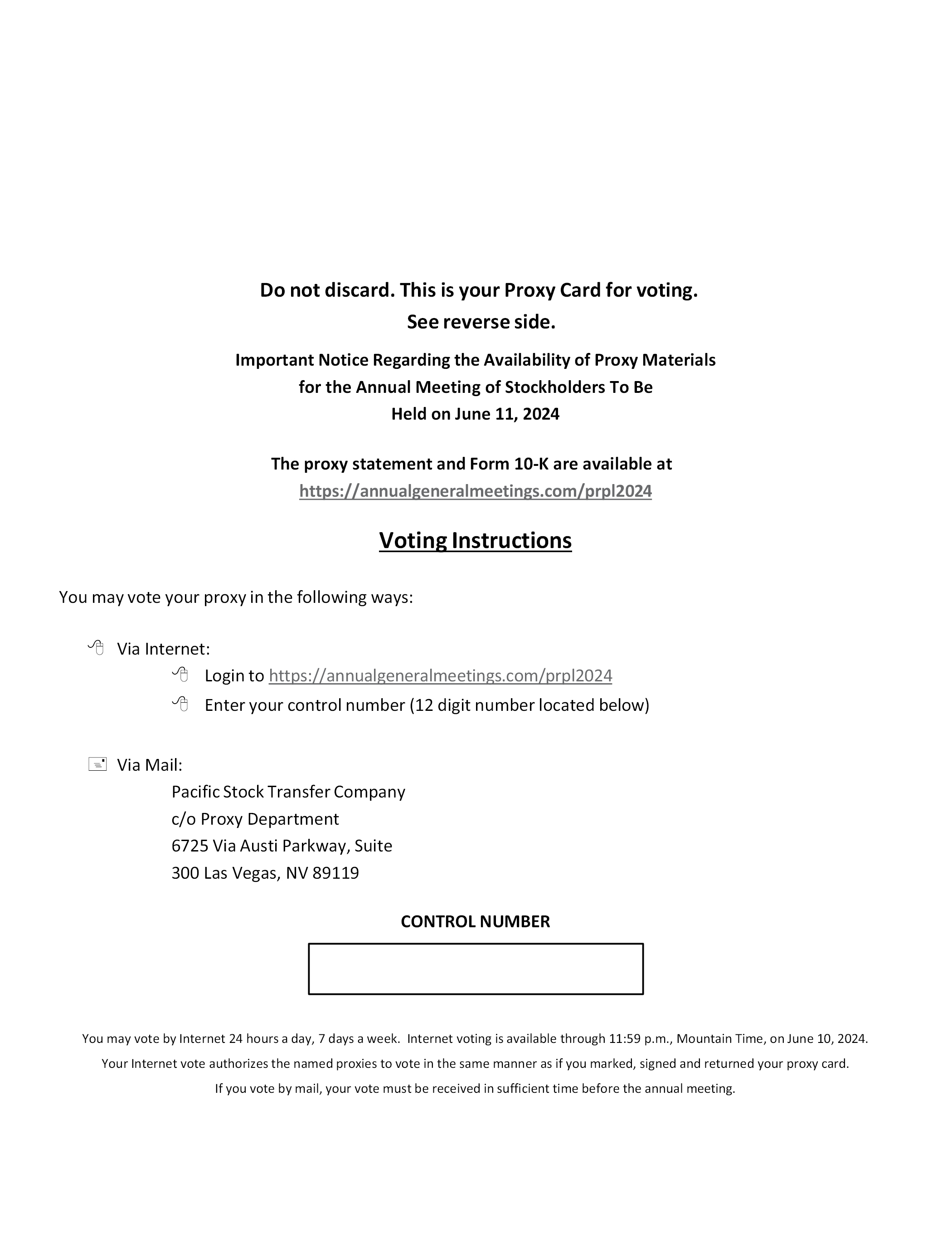 Do not discard. This is your Proxy Card for voting. See reverse side. Important Notice Regarding the Availability of Proxy Materials for the Annual Meeting of Stockholders To Be Held on June 11, 2024 The proxy statement and Form 10-K are available at https://annualgeneralmeetings.com/prpl2024 Voting Instructions You may vote your proxy in the following ways: Via Internet: Login to https://annualgeneralmeetings.com/prpl2024 Enter your control number (12 digit number located below) Via Mail: Pacific Stock Transfer Company c/o Proxy Department 6725 Via Austi Parkway, Suite 300 Las Vegas, NV 89119 CONTROL NUMBER You may vote by Internet 24 hours a day, 7 days a week. Internet voting is available through 11:59 p.m., Mountain Time, on June 10, 2024. Your Internet vote authorizes the named proxies to vote in the same manner as if you marked, signed and returned your proxy card. If you vote by mail, your vote must be received in sufficient time before the annual meeting.