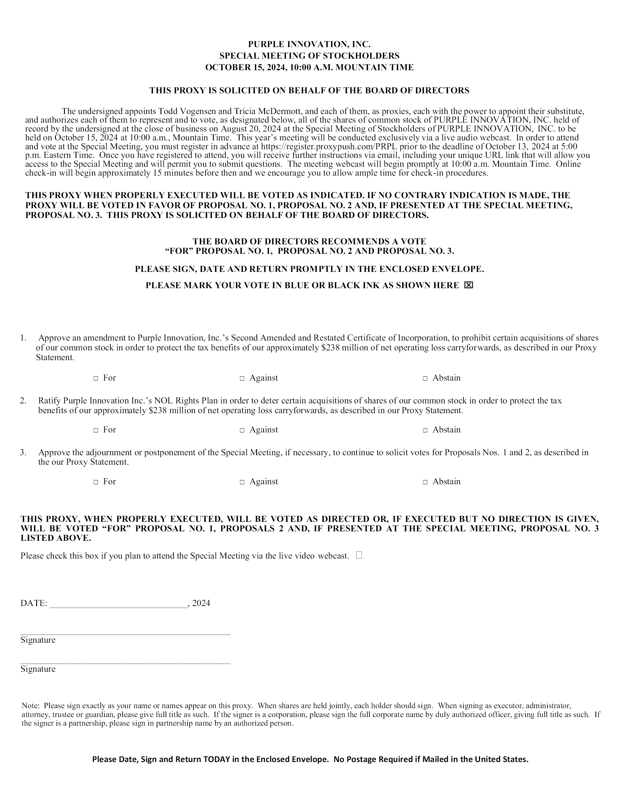 PURPLE INNOVATION, INC. SPECIAL MEETING OF STOCKHOLDERS OCTOBER 15, 2024, 10:00 A.M. MOUNTAIN TIME THIS PROXY IS SOLICITED ON BEHALF OF THE BOARD OF DIRECTORS The undersigned appoints Todd Vogensen and Tricia McDermott, and each of them, as proxies, each with the power to appoint their substitute, and authorizes each of them to represent and to vote, as designated below, all of the shares of common stock of PURPLE INNOVATION, INC. held of record by the undersigned at the close of business on August 20, 2024 at the Special Meeting of Stockholders of PURPLE INNOVATION, INC. to be held on October 15, 2024 at 10:00 a.m., Mountain Time. This year’s meeting will be conducted exclusively via a live audio webcast. In order to attend and vote at the Special Meeting, you must register in advance at https://register.proxypush.com/PRPL prior to the deadline of October 13, 2024 at 5:00 p.m. Eastern Time. Once you have registered to attend, you will receive further instructions via email, including your unique URL link that will allow you access to the Special Meeting and will permit you to submit questions. The meeting webcast will begin promptly at 10:00 a.m. Mountain Time. Online check-in will begin approximately 15 minutes before then and we encourage you to allow ample time for check-in procedures. THIS PROXY WHEN PROPERLY EXECUTED WILL BE VOTED AS INDICATED. IF NO CONTRARY INDICATION IS MADE, THE PROXY WILL BE VOTED IN FAVOR OF PROPOSAL NO. 1, PROPOSAL NO. 2 AND, IF PRESENTED AT THE SPECIAL MEETING, PROPOSAL NO. 3. THIS PROXY IS SOLICITED ON BEHALF OF THE BOARD OF DIRECTORS. THE BOARD OF DIRECTORS RECOMMENDS A VOTE “FOR” PROPOSAL NO. 1, PROPOSAL NO. 2 AND PROPOSAL NO. 3. PLEASE SIGN, DATE AND RETURN PROMPTLY IN THE ENCLOSED ENVELOPE. PLEASE MARK YOUR VOTE IN BLUE OR BLACK INK AS SHOWN HERE 1. Approve an amendment to Purple Innovation, Inc.’s Second Amended and Restated Certificate of Incorporation, to prohibit certain acquisitions of shares of our common stock in order to protect the tax benefits of our approximately $238 million of net operating loss carryforwards, as described in our Proxy Statement. For Against Abstain 2. Ratify Purple Innovation Inc.’s NOL Rights Plan in order to deter certain acquisitions of shares of our common stock in order to protect the tax benefits of our approximately $238 million of net operating loss carryforwards, as described in our Proxy Statement. For Against Abstain 3. Approve the adjournment or postponement of the Special Meeting, if necessary, to continue to solicit votes for Proposals Nos. 1 and 2, as described in the our Proxy Statement. For Against Abstain DATE:, 2024 Signature Signature THIS PROXY, WHEN PROPERLY EXECUTED, WILL BE VOTED AS DIRECTED OR, IF EXECUTED BUT NO DIRECTION IS GIVEN, WILL BE VOTED “FOR” PROPOSAL NO. 1, PROPOSALS 2 AND, IF PRESENTED AT THE SPECIAL MEETING, PROPOSAL NO. 3 LISTED ABOVE. Please check this box if you plan to attend the Special Meeting via the live video webcast. Note: Please sign exactly as your name or names appear on this proxy. When shares are held jointly, each holder should sign. When signing as executor, administrator, attorney, trustee or guardian, please give full title as such. If the signer is a corporation, please sign the full corporate name by duly authorized officer, giving full title as such. If the signer is a partnership, please sign in partnership name by an authorized person. Please Date, Sign and Return TODAY in the Enclosed Envelope. No Postage Required if Mailed in the United States.