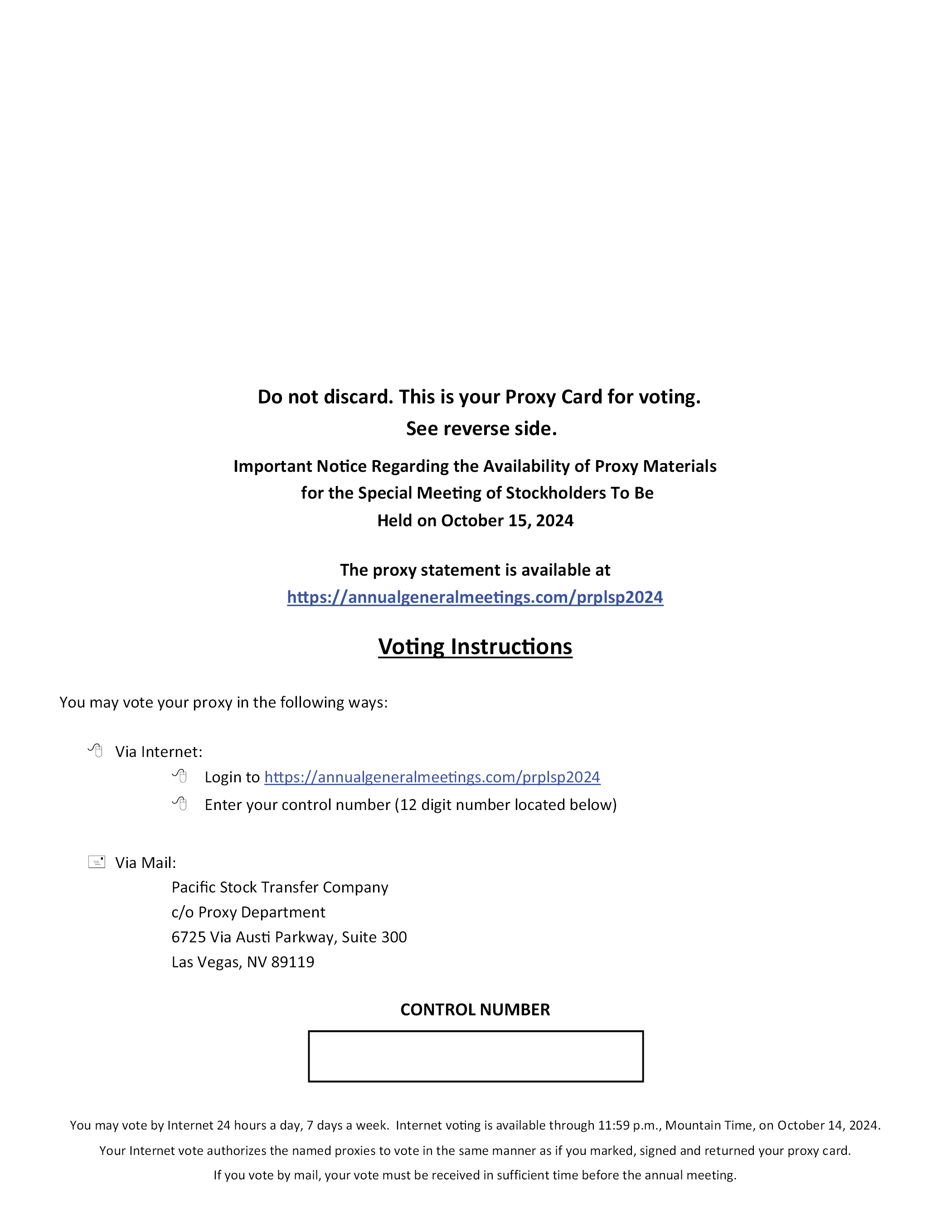 Do not discard. This is your Proxy Card for voting. See reverse side. Important Notice Regarding the Availability of Proxy Materials for the Special Meeting of Stockholders To Be Held on October 15, 2024 The proxy statement is available at https://annualgeneralmeetings.com/prplsp2024 Voting Instructions You may vote your proxy in the following ways: Via Internet: Login to https://annualgeneralmeetings.com/prplsp2024 Enter your control number (12 digit number located below) Via Mail: Pacific Stock Transfer Company c/o Proxy Department 6725 Via Austi Parkway, Suite 300 Las Vegas, NV 89119 CONTROL NUMBER You may vote by Internet 24 hours a day, 7 days a week. Internet voting is available through 11:59 p.m., Mountain Time, on October 14, 2024. Your Internet vote authorizes the named proxies to vote in the same manner as if you marked, signed and returned your proxy card. If you vote by mail, your vote must be received in sufficient time before the annual meeting.