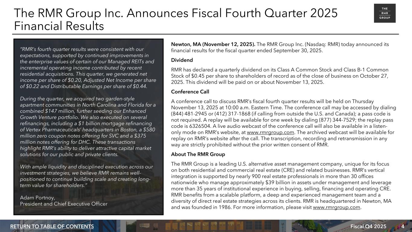 4Fiscal Q4 2025RETURN TO TABLE OF CONTENTS Newton, MA (November 12, 2025). The RMR Group Inc. (Nasdaq: RMR) today announced its financial results for the fiscal quarter ended September 30, 2025. Dividend RMR has declared a quarterly dividend on its Class A Common Stock and Class B-1 Common Stock of $0.45 per share to shareholders of record as of the close of business on October 27, 2025. This dividend will be paid on or about November 13, 2025. Conference Call A conference call to discuss RMR’s fiscal fourth quarter results will be held on Thursday November 13, 2025 at 10:00 a.m. Eastern Time. The conference call may be accessed by dialing (844) 481-2945 or (412) 317-1868 (if calling from outside the U.S. and Canada); a pass code is not required. A replay will be available for one week by dialing (877) 344-7529; the replay pass code is 6326504. A live audio webcast of the conference call will also be available in a listen- only mode on RMR’s website, at www.rmrgroup.com. The archived webcast will be available for replay on RMR’s website after the call. The transcription, recording and retransmission in any way are strictly prohibited without the prior written consent of RMR. About The RMR Group The RMR Group is a leading U.S. alternative asset management company, unique for its focus on both residential and commercial real estate (CRE) and related businesses. RMR’s vertical integration is supported by nearly 900 real estate professionals in more than 30 offices nationwide who manage approximately $39 billion in assets under management and leverage more than 35 years of institutional experience in buying, selling, financing and operating CRE. RMR benefits from a scalable platform, a deep and experienced management team and a diversity of direct real estate strategies across its clients. RMR is headquartered in Newton, MA and was founded in 1986. For more information, please visit www.rmrgroup.com. “RMR’s fourth quarter results were consistent with our expectations, supported by continued improvements in the enterprise values of certain of our Managed REITs and incremental operating income contributed by recent residential acquisitions. This quarter, we generated net income per share of $0.20, Adjusted Net Income per share of $0.22 and Distributable Earnings per share of $0.44. During the quarter, we acquired two garden-style apartment communities in North Carolina and Florida for a combined $147 million, further seeding our Enhanced Growth Venture portfolio. We also executed on several refinancings, including a $1 billion mortgage refinancing of Vertex Pharmaceuticals’ headquarters in Boston, a $580 million zero coupon notes offering for SVC and a $375 million notes offering for DHC. These transactions highlight RMR’s ability to deliver attractive capital market solutions for our public and private clients. With ample liquidity and disciplined execution across our investment strategies, we believe RMR remains well- positioned to continue building scale and creating long- term value for shareholders.” Adam Portnoy, President and Chief Executive Officer The RMR Group Inc. Announces Fiscal Fourth Quarter 2025 Financial Results