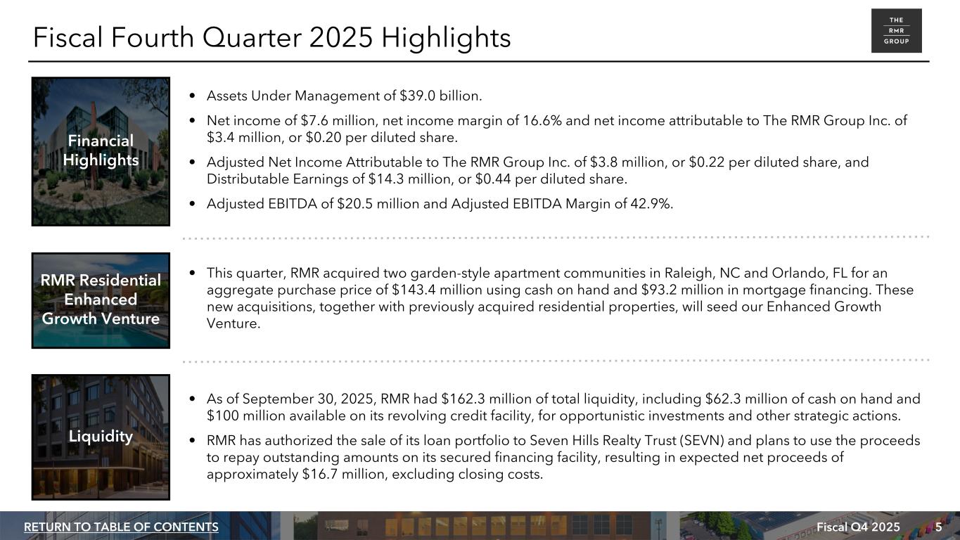 5Fiscal Q4 2025RETURN TO TABLE OF CONTENTS Liquidity Financial Highlights RMR Residential Enhanced Growth Venture • Assets Under Management of $39.0 billion. • Net income of $7.6 million, net income margin of 16.6% and net income attributable to The RMR Group Inc. of $3.4 million, or $0.20 per diluted share. • Adjusted Net Income Attributable to The RMR Group Inc. of $3.8 million, or $0.22 per diluted share, and Distributable Earnings of $14.3 million, or $0.44 per diluted share. • Adjusted EBITDA of $20.5 million and Adjusted EBITDA Margin of 42.9%. Fiscal Fourth Quarter 2025 Highlights • This quarter, RMR acquired two garden-style apartment communities in Raleigh, NC and Orlando, FL for an aggregate purchase price of $143.4 million using cash on hand and $93.2 million in mortgage financing. These new acquisitions, together with previously acquired residential properties, will seed our Enhanced Growth Venture. • As of September 30, 2025, RMR had $162.3 million of total liquidity, including $62.3 million of cash on hand and $100 million available on its revolving credit facility, for opportunistic investments and other strategic actions. • RMR has authorized the sale of its loan portfolio to Seven Hills Realty Trust (SEVN) and plans to use the proceeds to repay outstanding amounts on its secured financing facility, resulting in expected net proceeds of approximately $16.7 million, excluding closing costs.