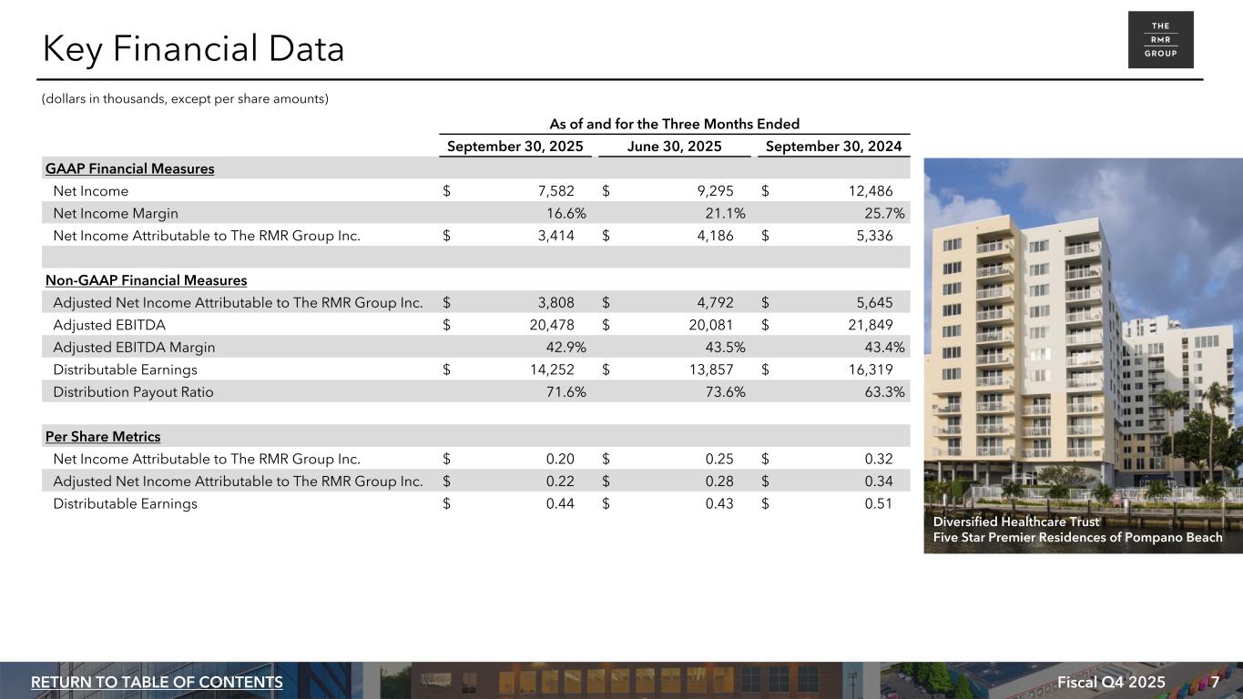 7Fiscal Q4 2025RETURN TO TABLE OF CONTENTS Key Financial Data As of and for the Three Months Ended September 30, 2025 June 30, 2025 September 30, 2024 GAAP Financial Measures Net Income $ 7,582 $ 9,295 $ 12,486 Net Income Margin 16.6% 21.1% 25.7% Net Income Attributable to The RMR Group Inc. $ 3,414 $ 4,186 $ 5,336 Non-GAAP Financial Measures Adjusted Net Income Attributable to The RMR Group Inc. $ 3,808 $ 4,792 $ 5,645 Adjusted EBITDA $ 20,478 $ 20,081 $ 21,849 Adjusted EBITDA Margin 42.9% 43.5% 43.4% Distributable Earnings $ 14,252 $ 13,857 $ 16,319 Distribution Payout Ratio 71.6% 73.6% 63.3% Per Share Metrics Net Income Attributable to The RMR Group Inc. $ 0.20 $ 0.25 $ 0.32 Adjusted Net Income Attributable to The RMR Group Inc. $ 0.22 $ 0.28 $ 0.34 Distributable Earnings $ 0.44 $ 0.43 $ 0.51 (dollars in thousands, except per share amounts) Diversified Healthcare Trust Five Star Premier Residences of Pompano Beach