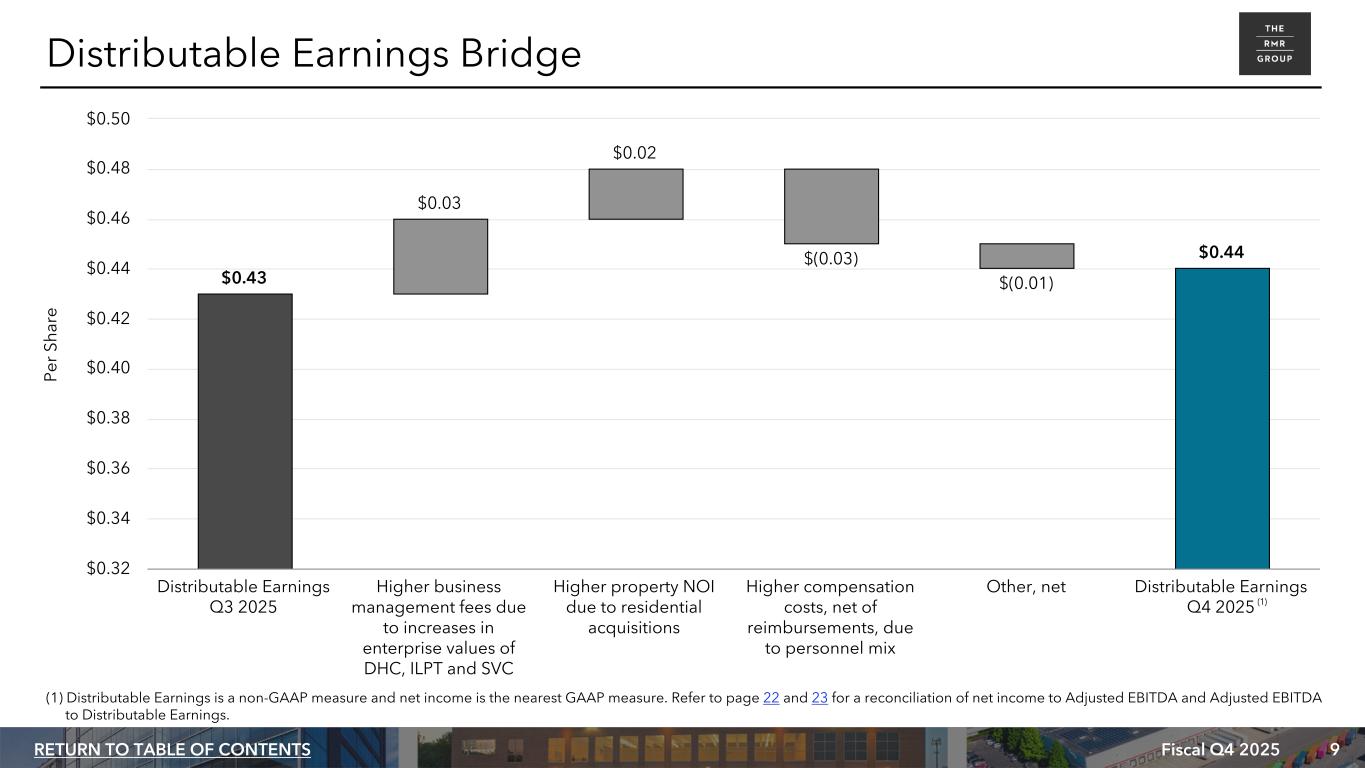 31Fiscal Q4 2025RETURN TO TABLE OF CONTENTS This presentation contains forward-looking statements within the meaning of the Private Securities Litigation Reform Act of 1995 and other securities laws that are subject to risks and uncertainties. These statements may include words such as “believe”, “expect”, “anticipate”, “intend”, “plan”, “estimate”, "opportunity", “will”, “may”, "positioned", "potential" and negatives or derivatives of these or similar expressions. These forward-looking statements include, among others, statements about: RMR's business strategy; economic and industry conditions, including as a result of changing tariffs or trade policies and the related uncertainty thereof; the impact and opportunities for RMR and RMR's clients' businesses from business cycles in the U.S. real estate industry as well as economic and industry conditions, including interest rates; RMR's belief that it is possible to grow real estate based businesses in selected property types or geographic areas despite national trends; RMR's liquidity, including its sufficiency to pursue a range of capital allocation strategies and fund RMR's operations and enhance its technology infrastructure and limit risk exposure; RMR's future profitability; and RMR's sustainability practices. Forward-looking statements reflect RMR’s current expectations, are based on judgments and assumptions, are inherently uncertain and are subject to risks, uncertainties and other factors, which could cause RMR's actual results, performance or achievements to differ materially from expected future results, performance or achievements expressed or implied in those forward-looking statements. Some of the risks, uncertainties and other factors that may cause actual results, performance or achievements to differ materially from those expressed or implied by forward-looking statements include, but are not limited to, the following: The dependence of RMR's revenues on a limited number of clients; the variability of its revenues; risks related to supply chain constraints, commodity pricing and inflation, including inflation impacting wages and employee benefits; changing market conditions, practices and trends, which may adversely impact its clients and the fees RMR receives from them; OPI's voluntary chapter 11 process to restructure its debt obligations and capital structure, which may reduce our management fee revenue over time and may result in reputational harm to us; potential terminations of the management agreements with its clients; uncertainty surrounding interest rates and sustained high interest rates, which may impact RMR's clients and significantly reduce RMR's revenues or impede its growth; RMR's dependence on the growth and performance of its clients; RMR's ability to obtain or create new clients for its business which is often dependent on circumstances beyond RMR's control; the ability of RMR's clients to operate their businesses profitably, optimize their capital structures, comply with the terms of their debt agreements and financial covenants and to grow and increase their market capitalizations and total shareholder returns; RMR's ability to successfully provide management services to its clients; RMR's ability to maintain or increase the distributions RMR pays to its shareholders; RMR's ability to successfully pursue and execute capital allocation and new business strategies; RMR's ability to prudently invest in its business to enhance its operations, services and competitive positioning; RMR's ability to successfully grow the RMR Residential business and realize RMR's expected returns on its investment within the anticipated timeframe; RMR's ability to successfully integrate acquired businesses and realize the expected returns on its investments; the ability of Tremont to identify and close suitable investments for SEVN and to monitor, service and administer existing investments; RMR's ability to obtain additional capital from third party investors for our private capital initiatives in order to make additional investments and to increase potential returns; changes to RMR's operating leverage or client diversity; litigation risks; risks related to acquisitions, dispositions and other activities by RMR or among its clients; allegations, even if untrue, of any conflicts of interest arising from RMR's management activities; RMR's ability to retain the services of its managing directors and other key personnel; RMR's and its clients’ risks associated with RMR's and its clients' costs of compliance with laws and regulations, including securities regulations, exchange listing standards and other laws and regulations affecting public companies; and other matters. These risks, uncertainties and other factors are not exhaustive and should be read in conjunction with other cautionary statements that are included in RMR's periodic filings. The information contained in RMR’s filings with the Securities and Exchange Commission (SEC), including under the caption “Risk Factors” in its periodic reports, or incorporated therein, identifies important factors that could cause differences from the forward-looking statements in this presentation. RMR’s filings with the SEC are available on the SEC’s website at www.sec.gov. You should not place undue reliance on forward-looking statements. Except as required by law, RMR does not intend to update or change any forward-looking statements as a result of new information, future events or otherwise. Warning Concerning Forward-Looking Statements