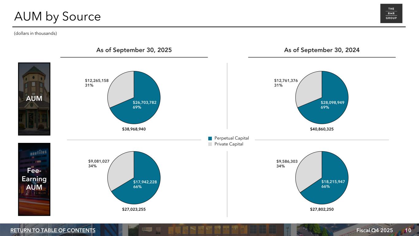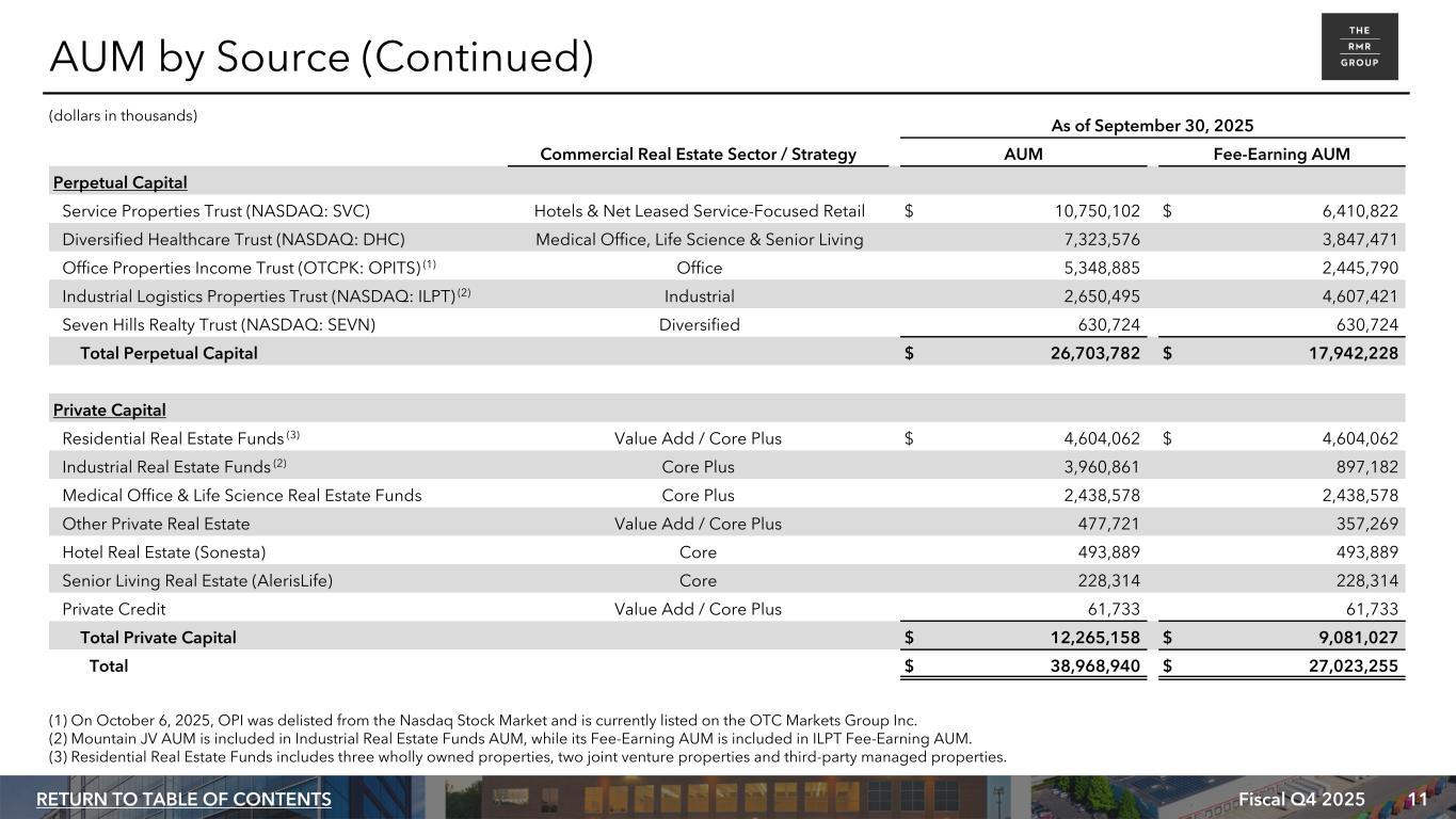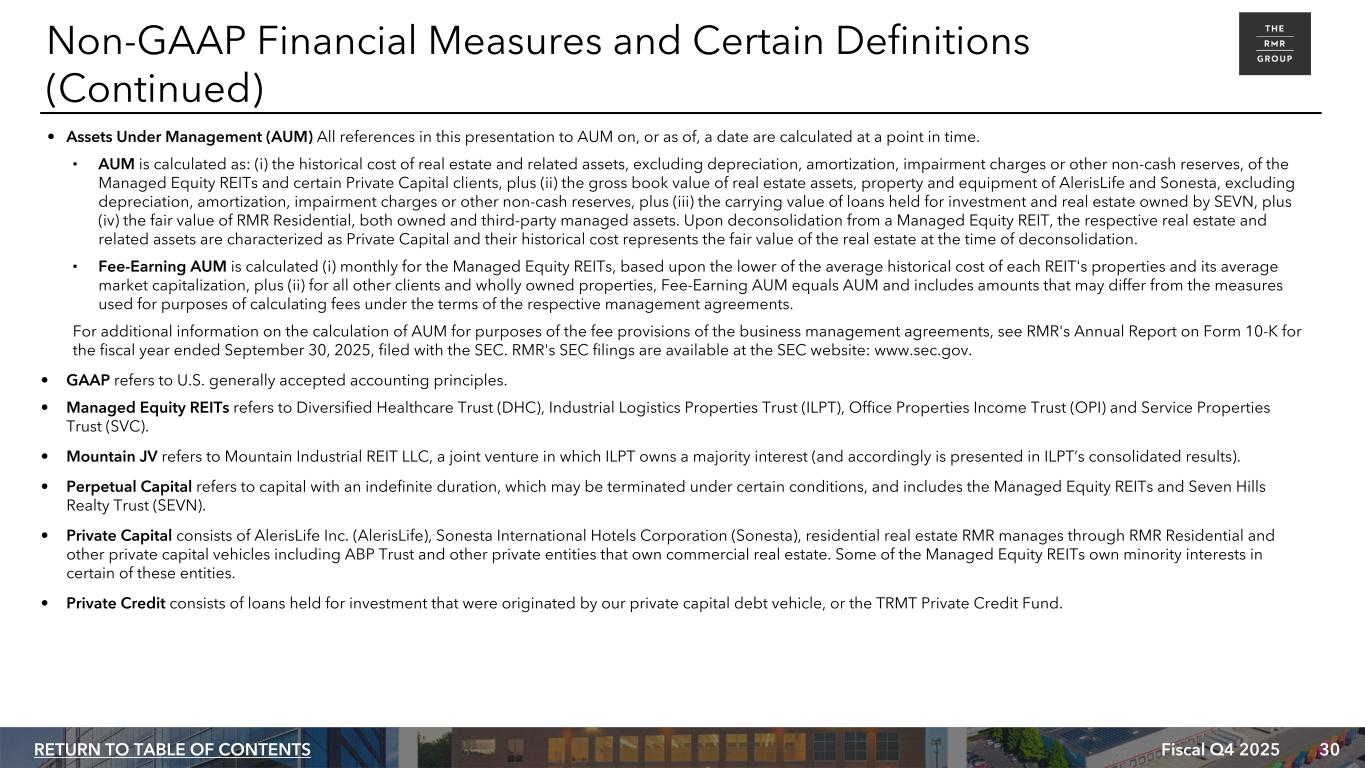 30Fiscal Q4 2025RETURN TO TABLE OF CONTENTS • Assets Under Management (AUM) All references in this presentation to AUM on, or as of, a date are calculated at a point in time. ▪ AUM is calculated as: (i) the historical cost of real estate and related assets, excluding depreciation, amortization, impairment charges or other non-cash reserves, of the Managed Equity REITs and certain Private Capital clients, plus (ii) the gross book value of real estate assets, property and equipment of AlerisLife and Sonesta, excluding depreciation, amortization, impairment charges or other non-cash reserves, plus (iii) the carrying value of loans held for investment and real estate owned by SEVN, plus (iv) the fair value of RMR Residential, both owned and third-party managed assets. Upon deconsolidation from a Managed Equity REIT, the respective real estate and related assets are characterized as Private Capital and their historical cost represents the fair value of the real estate at the time of deconsolidation. ▪ Fee-Earning AUM is calculated (i) monthly for the Managed Equity REITs, based upon the lower of the average historical cost of each REIT's properties and its average market capitalization, plus (ii) for all other clients and wholly owned properties, Fee-Earning AUM equals AUM and includes amounts that may differ from the measures used for purposes of calculating fees under the terms of the respective management agreements. For additional information on the calculation of AUM for purposes of the fee provisions of the business management agreements, see RMR's Annual Report on Form 10-K for the fiscal year ended September 30, 2025, filed with the SEC. RMR's SEC filings are available at the SEC website: www.sec.gov. • GAAP refers to U.S. generally accepted accounting principles. • Managed Equity REITs refers to Diversified Healthcare Trust (DHC), Industrial Logistics Properties Trust (ILPT), Office Properties Income Trust (OPI) and Service Properties Trust (SVC). • Mountain JV refers to Mountain Industrial REIT LLC, a joint venture in which ILPT owns a majority interest (and accordingly is presented in ILPT’s consolidated results). • Perpetual Capital refers to capital with an indefinite duration, which may be terminated under certain conditions, and includes the Managed Equity REITs and Seven Hills Realty Trust (SEVN). • Private Capital consists of AlerisLife Inc. (AlerisLife), Sonesta International Hotels Corporation (Sonesta), residential real estate RMR manages through RMR Residential and other private capital vehicles including ABP Trust and other private entities that own commercial real estate. Some of the Managed Equity REITs own minority interests in certain of these entities. • Private Credit consists of loans held for investment that were originated by our private capital debt vehicle, or the TRMT Private Credit Fund. Non-GAAP Financial Measures and Certain Definitions (Continued)