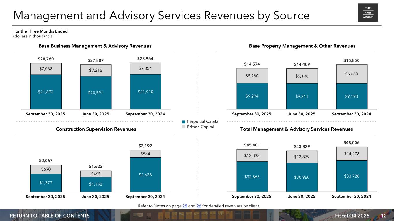 25Fiscal Q4 2025RETURN TO TABLE OF CONTENTS Notes to Page 12 – Management and Advisory Services Revenues by Source The following tables present revenues by client and exclude incentive fees earned from SEVN of $337, $229 and $484 during the three months ended September 30, 2025, June 30, 2025 and September 30, 2024, respectively. For the Three Months Ended September 30, 2025 June 30, 2025 September 30, 2024 BASE BUSINESS MANAGEMENT & ADVISORY REVENUES DHC $ 4,085 $ 3,859 $ 4,436 ILPT 5,966 5,793 5,983 OPI 2,804 2,778 2,800 SVC 7,722 7,046 7,563 SEVN 1,115 1,115 1,128 Total Perpetual Capital 21,692 20,591 21,910 AlerisLife 1,447 1,452 1,357 Sonesta 2,441 2,628 2,515 RMR Residential 118 118 154 Other private entities 3,062 3,018 3,028 Total Private Capital 7,068 7,216 7,054 Total Base Business Management & Advisory Revenues $ 28,760 $ 27,807 $ 28,964 BASE PROPERTY MANAGEMENT & OTHER REVENUES DHC $ 1,229 $ 1,220 $ 1,373 ILPT 3,249 3,237 3,199 OPI 2,635 2,628 3,090 SVC 2,161 2,110 1,513 SEVN 20 16 15 Total Perpetual Capital 9,294 9,211 9,190 RMR Residential 3,066 2,958 4,501 Other private entities 2,214 2,240 2,159 Total Private Capital 5,280 5,198 6,660 Total Base Property Management & Other Revenues $ 14,574 $ 14,409 $ 15,850 Notes (dollars in thousands)
