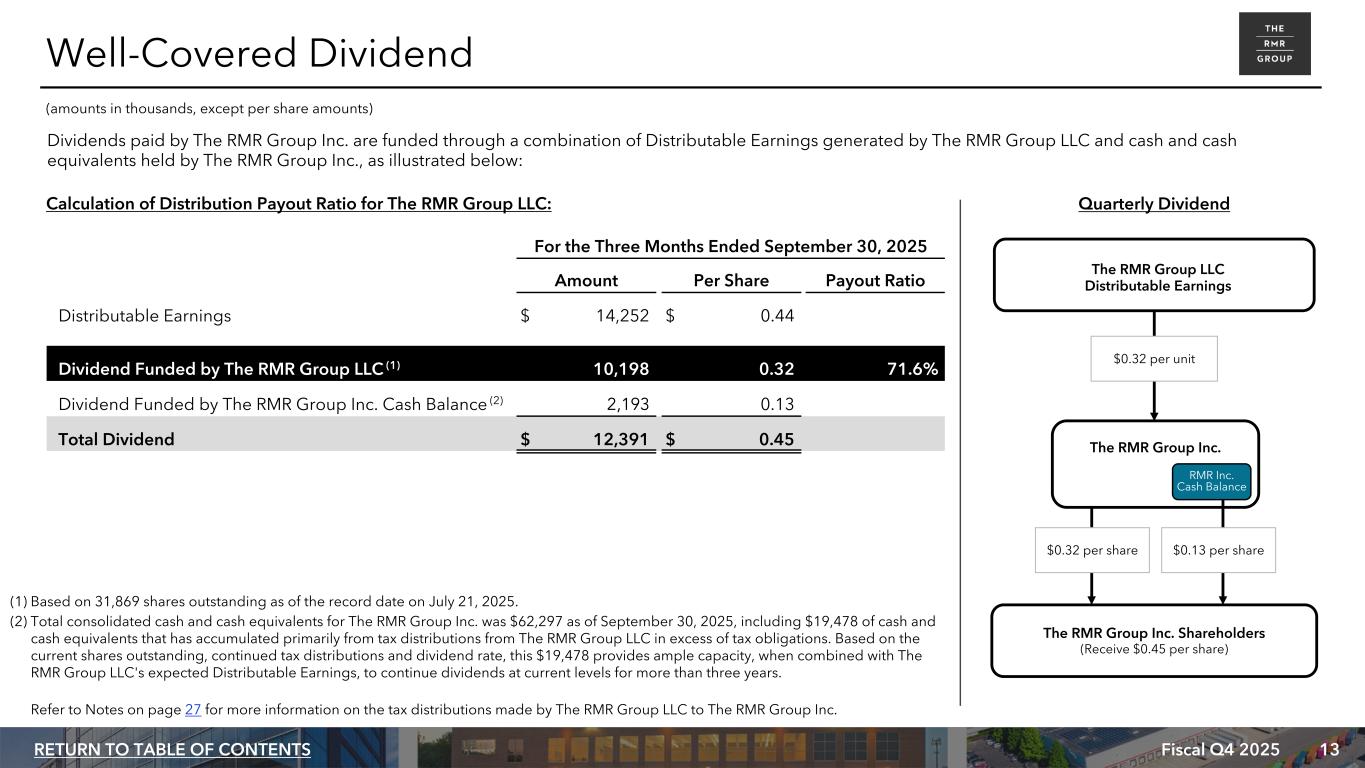13Fiscal Q4 2025RETURN TO TABLE OF CONTENTS The RMR Group Inc. For the Three Months Ended September 30, 2025 Amount Per Share Payout Ratio Distributable Earnings $ 14,252 $ 0.44 Dividend Funded by The RMR Group LLC (1) 10,198 0.32 71.6% Dividend Funded by The RMR Group Inc. Cash Balance (2) 2,193 0.13 Total Dividend $ 12,391 $ 0.45 Well-Covered Dividend (amounts in thousands, except per share amounts) Dividends paid by The RMR Group Inc. are funded through a combination of Distributable Earnings generated by The RMR Group LLC and cash and cash equivalents held by The RMR Group Inc., as illustrated below: The RMR Group Inc. Shareholders (Receive $0.45 per share) Quarterly DividendCalculation of Distribution Payout Ratio for The RMR Group LLC: (1) Based on 31,869 shares outstanding as of the record date on July 21, 2025. (2) Total consolidated cash and cash equivalents for The RMR Group Inc. was $62,297 as of September 30, 2025, including $19,478 of cash and cash equivalents that has accumulated primarily from tax distributions from The RMR Group LLC in excess of tax obligations. Based on the current shares outstanding, continued tax distributions and dividend rate, this $19,478 provides ample capacity, when combined with The RMR Group LLC's expected Distributable Earnings, to continue dividends at current levels for more than three years. Refer to Notes on page 27 for more information on the tax distributions made by The RMR Group LLC to The RMR Group Inc. The RMR Group LLC Distributable Earnings $0.32 per unit $0.32 per share $0.13 per share RMR Inc. Cash Balance