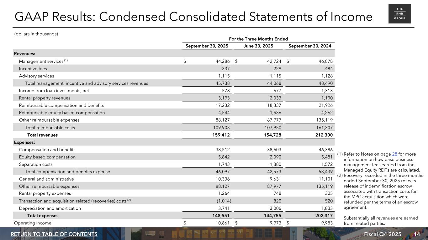 14Fiscal Q4 2025RETURN TO TABLE OF CONTENTS For the Three Months Ended September 30, 2025 June 30, 2025 September 30, 2024 Revenues: Management services (1) $ 44,286 $ 42,724 $ 46,878 Incentive fees 337 229 484 Advisory services 1,115 1,115 1,128 Total management, incentive and advisory services revenues 45,738 44,068 48,490 Income from loan investments, net 578 677 1,313 Rental property revenues 3,193 2,033 1,190 Reimbursable compensation and benefits 17,232 18,337 21,926 Reimbursable equity based compensation 4,544 1,636 4,262 Other reimbursable expenses 88,127 87,977 135,119 Total reimbursable costs 109,903 107,950 161,307 Total revenues 159,412 154,728 212,300 Expenses: Compensation and benefits 38,512 38,603 46,386 Equity based compensation 5,842 2,090 5,481 Separation costs 1,743 1,880 1,572 Total compensation and benefits expense 46,097 42,573 53,439 General and administrative 10,336 9,631 11,101 Other reimbursable expenses 88,127 87,977 135,119 Rental property expenses 1,264 748 305 Transaction and acquisition related (recoveries) costs (2) (1,014) 820 520 Depreciation and amortization 3,741 3,006 1,833 Total expenses 148,551 144,755 202,317 Operating income $ 10,861 $ 9,973 $ 9,983 (1) Refer to Notes on page 28 for more information on how base business management fees earned from the Managed Equity REITs are calculated. (2) Recovery recorded in the three months ended September 30, 2025 reflects release of indemnification escrow associated with transaction costs for the MPC acquisition which were refunded per the terms of an escrow agreement. Substantially all revenues are earned from related parties. (dollars in thousands) GAAP Results: Condensed Consolidated Statements of Income