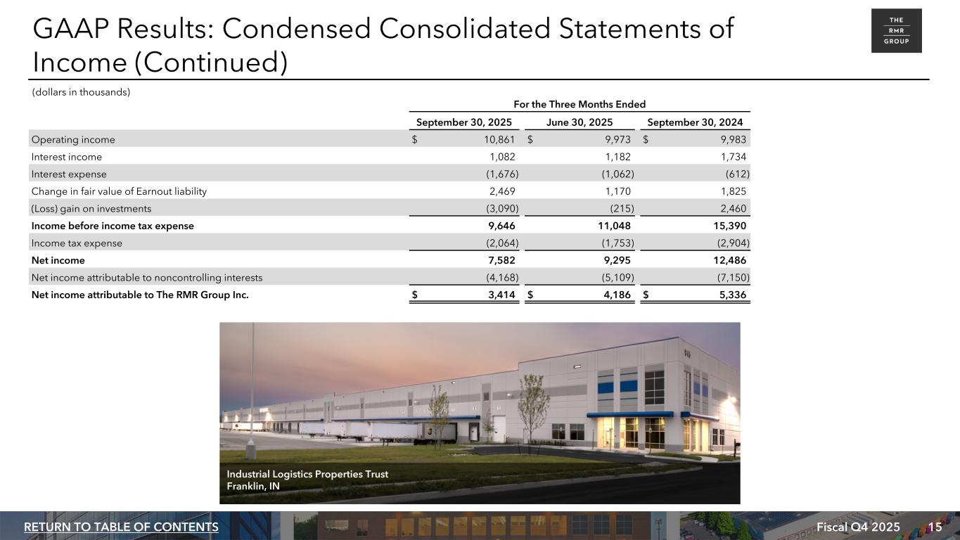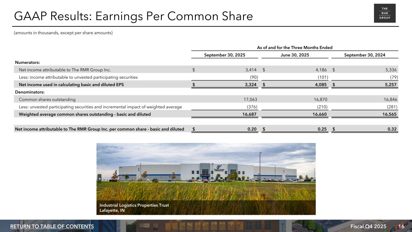 15Fiscal Q4 2025RETURN TO TABLE OF CONTENTS For the Three Months Ended September 30, 2025 June 30, 2025 September 30, 2024 Operating income $ 10,861 $ 9,973 $ 9,983 Interest income 1,082 1,182 1,734 Interest expense (1,676) (1,062) (612) Change in fair value of Earnout liability 2,469 1,170 1,825 (Loss) gain on investments (3,090) (215) 2,460 Income before income tax expense 9,646 11,048 15,390 Income tax expense (2,064) (1,753) (2,904) Net income 7,582 9,295 12,486 Net income attributable to noncontrolling interests (4,168) (5,109) (7,150) Net income attributable to The RMR Group Inc. $ 3,414 $ 4,186 $ 5,336 GAAP Results: Condensed Consolidated Statements of Income (Continued) (dollars in thousands) Industrial Logistics Properties Trust Franklin, IN