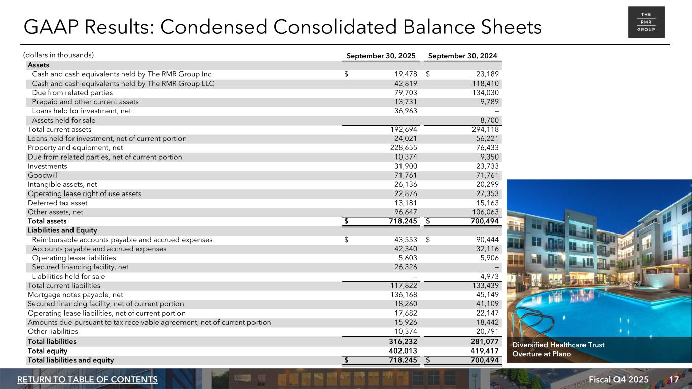 17Fiscal Q4 2025RETURN TO TABLE OF CONTENTS September 30, 2025 September 30, 2024 Assets Cash and cash equivalents held by The RMR Group Inc. $ 19,478 $ 23,189 Cash and cash equivalents held by The RMR Group LLC 42,819 118,410 Due from related parties 79,703 134,030 Prepaid and other current assets 13,731 9,789 Loans held for investment, net 36,963 — Assets held for sale — 8,700 Total current assets 192,694 294,118 Loans held for investment, net of current portion 24,021 56,221 Property and equipment, net 228,655 76,433 Due from related parties, net of current portion 10,374 9,350 Investments 31,900 23,733 Goodwill 71,761 71,761 Intangible assets, net 26,136 20,299 Operating lease right of use assets 22,876 27,353 Deferred tax asset 13,181 15,163 Other assets, net 96,647 106,063 Total assets $ 718,245 $ 700,494 Liabilities and Equity Reimbursable accounts payable and accrued expenses $ 43,553 $ 90,444 Accounts payable and accrued expenses 42,340 32,116 Operating lease liabilities 5,603 5,906 Secured financing facility, net 26,326 — Liabilities held for sale — 4,973 Total current liabilities 117,822 133,439 Mortgage notes payable, net 136,168 45,149 Secured financing facility, net of current portion 18,260 41,109 Operating lease liabilities, net of current portion 17,682 22,147 Amounts due pursuant to tax receivable agreement, net of current portion 15,926 18,442 Other liabilities 10,374 20,791 Total liabilities 316,232 281,077 Total equity 402,013 419,417 Total liabilities and equity $ 718,245 $ 700,494 GAAP Results: Condensed Consolidated Balance Sheets (dollars in thousands) Diversified Healthcare Trust Overture at Plano