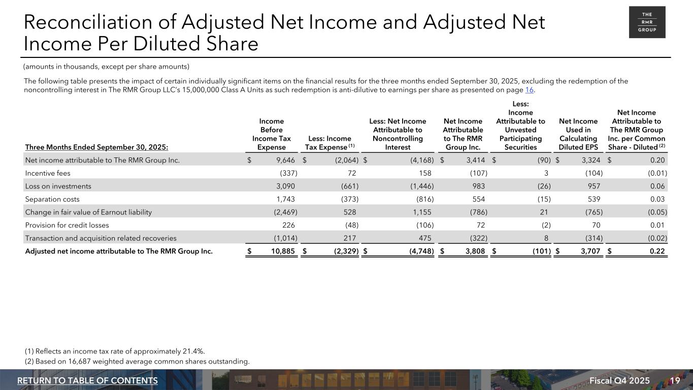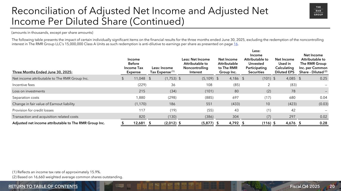 19Fiscal Q4 2025RETURN TO TABLE OF CONTENTS Three Months Ended September 30, 2025: Income Before Income Tax Expense Less: Income Tax Expense (1) Less: Net Income Attributable to Noncontrolling Interest Net Income Attributable to The RMR Group Inc. Less: Income Attributable to Unvested Participating Securities Net Income Used in Calculating Diluted EPS Net Income Attributable to The RMR Group Inc. per Common Share - Diluted (2) Net income attributable to The RMR Group Inc. $ 9,646 $ (2,064) $ (4,168) $ 3,414 $ (90) $ 3,324 $ 0.20 Incentive fees (337) 72 158 (107) 3 (104) (0.01) Loss on investments 3,090 (661) (1,446) 983 (26) 957 0.06 Separation costs 1,743 (373) (816) 554 (15) 539 0.03 Change in fair value of Earnout liability (2,469) 528 1,155 (786) 21 (765) (0.05) Provision for credit losses 226 (48) (106) 72 (2) 70 0.01 Transaction and acquisition related recoveries (1,014) 217 475 (322) 8 (314) (0.02) Adjusted net income attributable to The RMR Group Inc. $ 10,885 $ (2,329) $ (4,748) $ 3,808 $ (101) $ 3,707 $ 0.22 The following table presents the impact of certain individually significant items on the financial results for the three months ended September 30, 2025, excluding the redemption of the noncontrolling interest in The RMR Group LLC’s 15,000,000 Class A Units as such redemption is anti-dilutive to earnings per share as presented on page 16. (1) Reflects an income tax rate of approximately 21.4%. (2) Based on 16,687 weighted average common shares outstanding. Reconciliation of Adjusted Net Income and Adjusted Net Income Per Diluted Share (amounts in thousands, except per share amounts)