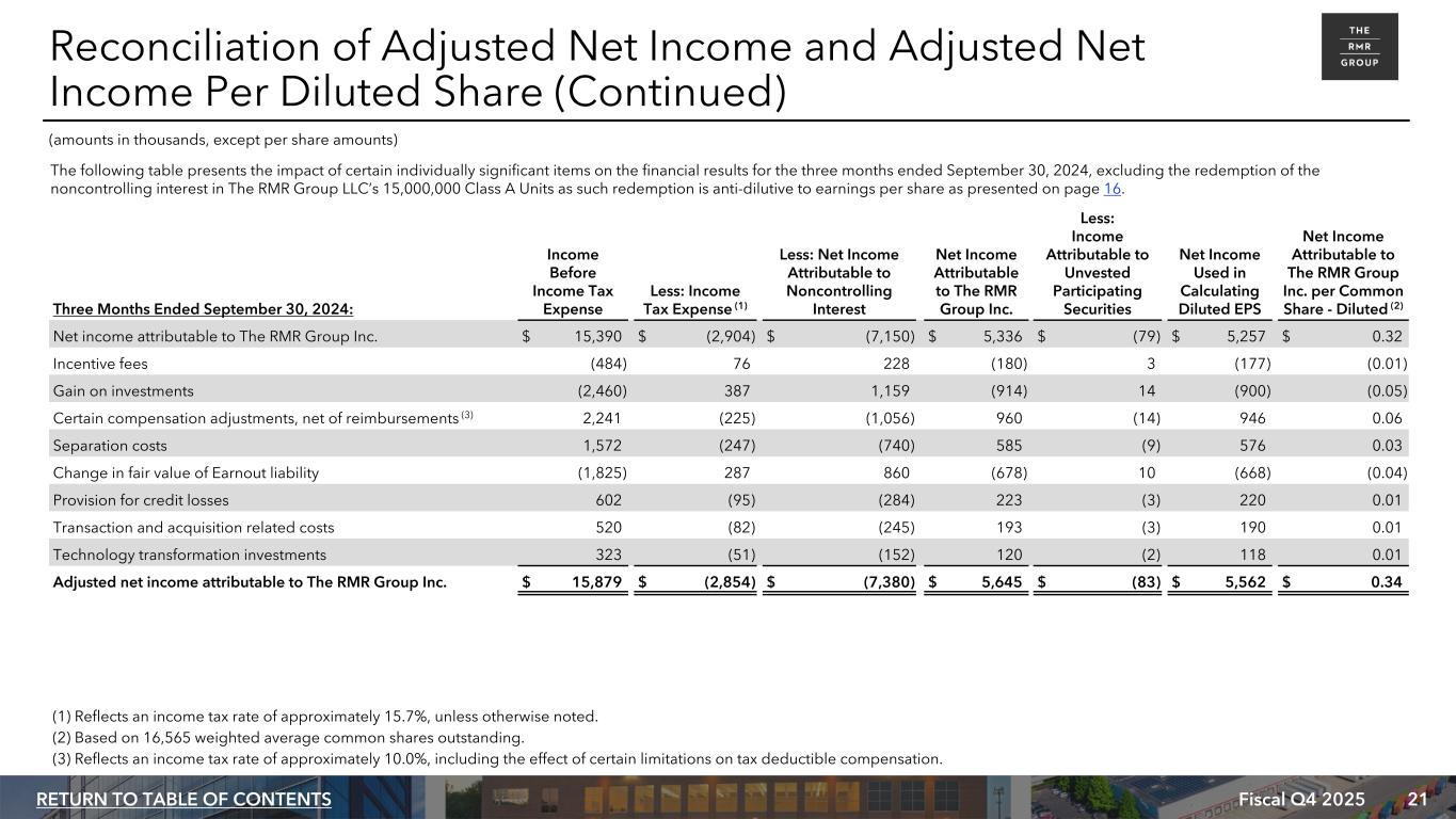 20Fiscal Q4 2025RETURN TO TABLE OF CONTENTS Reconciliation of Adjusted Net Income and Adjusted Net Income Per Diluted Share (Continued) (amounts in thousands, except per share amounts) The following table presents the impact of certain individually significant items on the financial results for the three months ended June 30, 2025, excluding the redemption of the noncontrolling interest in The RMR Group LLC’s 15,000,000 Class A Units as such redemption is anti-dilutive to earnings per share as presented on page 16. Three Months Ended June 30, 2025: Income Before Income Tax Expense Less: Income Tax Expense (1) Less: Net Income Attributable to Noncontrolling Interest Net Income Attributable to The RMR Group Inc. Less: Income Attributable to Unvested Participating Securities Net Income Used in Calculating Diluted EPS Net Income Attributable to The RMR Group Inc. per Common Share - Diluted (2) Net income attributable to The RMR Group Inc. $ 11,048 $ (1,753) $ (5,109) $ 4,186 $ (101) $ 4,085 $ 0.25 Incentive fees (229) 36 108 (85) 2 (83) — Loss on investments 215 (34) (101) 80 (2) 78 — Separation costs 1,880 (298) (885) 697 (17) 680 0.04 Change in fair value of Earnout liability (1,170) 186 551 (433) 10 (423) (0.03) Provision for credit losses 117 (19) (55) 43 (1) 42 — Transaction and acquisition related costs 820 (130) (386) 304 (7) 297 0.02 Adjusted net income attributable to The RMR Group Inc. $ 12,681 $ (2,012) $ (5,877) $ 4,792 $ (116) $ 4,676 $ 0.28 (1) Reflects an income tax rate of approximately 15.9%. (2) Based on 16,660 weighted average common shares outstanding.
