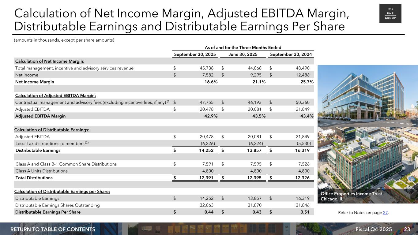 23Fiscal Q4 2025RETURN TO TABLE OF CONTENTS As of and for the Three Months Ended September 30, 2025 June 30, 2025 September 30, 2024 Calculation of Net Income Margin: Total management, incentive and advisory services revenue $ 45,738 $ 44,068 $ 48,490 Net income $ 7,582 $ 9,295 $ 12,486 Net Income Margin 16.6% 21.1% 25.7% Calculation of Adjusted EBITDA Margin: Contractual management and advisory fees (excluding incentive fees, if any) (1) $ 47,755 $ 46,193 $ 50,360 Adjusted EBITDA $ 20,478 $ 20,081 $ 21,849 Adjusted EBITDA Margin 42.9% 43.5% 43.4% Calculation of Distributable Earnings: Adjusted EBITDA $ 20,478 $ 20,081 $ 21,849 Less: Tax distributions to members (2) (6,226) (6,224) (5,530) Distributable Earnings $ 14,252 $ 13,857 $ 16,319 Class A and Class B-1 Common Share Distributions $ 7,591 $ 7,595 $ 7,526 Class A Units Distributions 4,800 4,800 4,800 Total Distributions $ 12,391 $ 12,395 $ 12,326 Calculation of Distributable Earnings per Share: Distributable Earnings $ 14,252 $ 13,857 $ 16,319 Distributable Earnings Shares Outstanding 32,063 31,870 31,846 Distributable Earnings Per Share $ 0.44 $ 0.43 $ 0.51 Calculation of Net Income Margin, Adjusted EBITDA Margin, Distributable Earnings and Distributable Earnings Per Share (amounts in thousands, except per share amounts) Refer to Notes on page 27. Office Properties Income Trust Chicago, IL