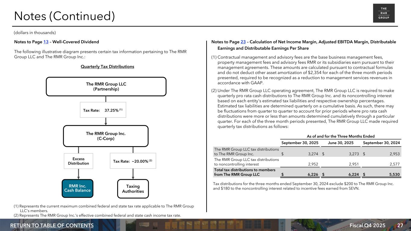 27Fiscal Q4 2025RETURN TO TABLE OF CONTENTS The RMR Group Inc. (C-Corp) The RMR Group LLC (Partnership) Quarterly Tax Distributions Notes to Page 13 – Well-Covered Dividend The following illustrative diagram presents certain tax information pertaining to The RMR Group LLC and The RMR Group Inc.: (1) Represents the current maximum combined federal and state tax rate applicable to The RMR Group LLC's members. (2) Represents The RMR Group Inc.'s effective combined federal and state cash income tax rate. Notes (Continued) Notes to Page 23 – Calculation of Net Income Margin, Adjusted EBITDA Margin, Distributable Earnings and Distributable Earnings Per Share (1) Contractual management and advisory fees are the base business management fees, property management fees and advisory fees RMR or its subsidiaries earn pursuant to their management agreements. These amounts are calculated pursuant to contractual formulas and do not deduct other asset amortization of $2,354 for each of the three month periods presented, required to be recognized as a reduction to management services revenues in accordance with GAAP. (2) Under The RMR Group LLC operating agreement, The RMR Group LLC is required to make quarterly pro rata cash distributions to The RMR Group Inc. and its noncontrolling interest based on each entity's estimated tax liabilities and respective ownership percentages. Estimated tax liabilities are determined quarterly on a cumulative basis. As such, there may be fluctuations from quarter to quarter to account for prior periods where pro rata cash distributions were more or less than amounts determined cumulatively through a particular quarter. For each of the three month periods presented, The RMR Group LLC made required quarterly tax distributions as follows: As of and for the Three Months Ended September 30, 2025 June 30, 2025 September 30, 2024 The RMR Group LLC tax distributions to The RMR Group Inc. $ 3,274 $ 3,273 $ 2,953 The RMR Group LLC tax distributions to noncontrolling interest 2,952 2,951 2,577 Total tax distributions to members from The RMR Group LLC $ 6,226 $ 6,224 $ 5,530 (dollars in thousands) Tax distributions for the three months ended September 30, 2024 exclude $200 to The RMR Group Inc. and $180 to the noncontrolling interest related to incentive fees earned from SEVN. Tax Rate: ~20.00% (2)Excess Distribution Taxing Authorities RMR Inc. Cash Balance Tax Rate: 37.25% (1)