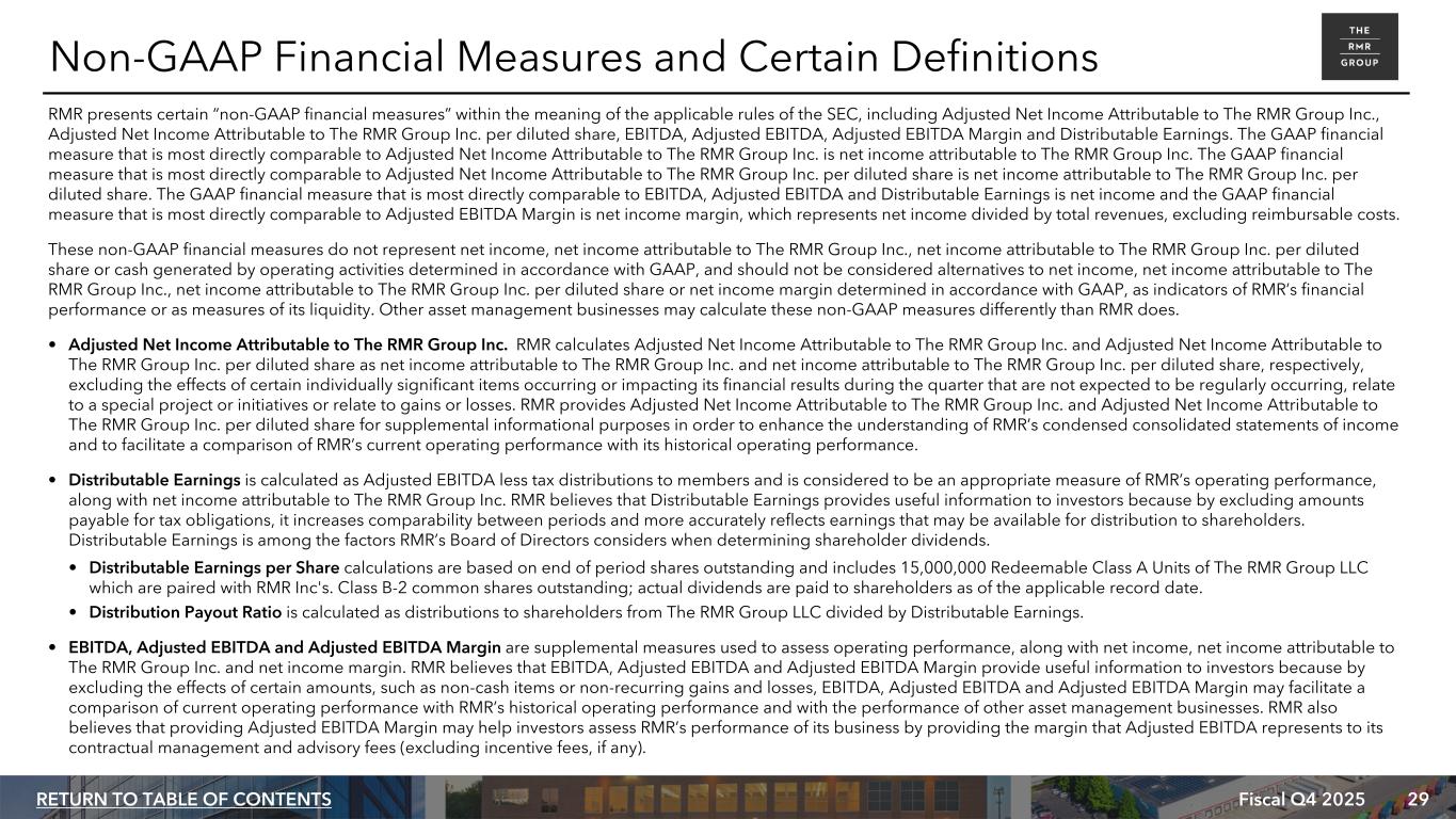 29Fiscal Q4 2025RETURN TO TABLE OF CONTENTS RMR presents certain “non-GAAP financial measures” within the meaning of the applicable rules of the SEC, including Adjusted Net Income Attributable to The RMR Group Inc., Adjusted Net Income Attributable to The RMR Group Inc. per diluted share, EBITDA, Adjusted EBITDA, Adjusted EBITDA Margin and Distributable Earnings. The GAAP financial measure that is most directly comparable to Adjusted Net Income Attributable to The RMR Group Inc. is net income attributable to The RMR Group Inc. The GAAP financial measure that is most directly comparable to Adjusted Net Income Attributable to The RMR Group Inc. per diluted share is net income attributable to The RMR Group Inc. per diluted share. The GAAP financial measure that is most directly comparable to EBITDA, Adjusted EBITDA and Distributable Earnings is net income and the GAAP financial measure that is most directly comparable to Adjusted EBITDA Margin is net income margin, which represents net income divided by total revenues, excluding reimbursable costs. These non-GAAP financial measures do not represent net income, net income attributable to The RMR Group Inc., net income attributable to The RMR Group Inc. per diluted share or cash generated by operating activities determined in accordance with GAAP, and should not be considered alternatives to net income, net income attributable to The RMR Group Inc., net income attributable to The RMR Group Inc. per diluted share or net income margin determined in accordance with GAAP, as indicators of RMR’s financial performance or as measures of its liquidity. Other asset management businesses may calculate these non-GAAP measures differently than RMR does. • Adjusted Net Income Attributable to The RMR Group Inc. RMR calculates Adjusted Net Income Attributable to The RMR Group Inc. and Adjusted Net Income Attributable to The RMR Group Inc. per diluted share as net income attributable to The RMR Group Inc. and net income attributable to The RMR Group Inc. per diluted share, respectively, excluding the effects of certain individually significant items occurring or impacting its financial results during the quarter that are not expected to be regularly occurring, relate to a special project or initiatives or relate to gains or losses. RMR provides Adjusted Net Income Attributable to The RMR Group Inc. and Adjusted Net Income Attributable to The RMR Group Inc. per diluted share for supplemental informational purposes in order to enhance the understanding of RMR’s condensed consolidated statements of income and to facilitate a comparison of RMR’s current operating performance with its historical operating performance. • Distributable Earnings is calculated as Adjusted EBITDA less tax distributions to members and is considered to be an appropriate measure of RMR’s operating performance, along with net income attributable to The RMR Group Inc. RMR believes that Distributable Earnings provides useful information to investors because by excluding amounts payable for tax obligations, it increases comparability between periods and more accurately reflects earnings that may be available for distribution to shareholders. Distributable Earnings is among the factors RMR’s Board of Directors considers when determining shareholder dividends. • Distributable Earnings per Share calculations are based on end of period shares outstanding and includes 15,000,000 Redeemable Class A Units of The RMR Group LLC which are paired with RMR Inc's. Class B-2 common shares outstanding; actual dividends are paid to shareholders as of the applicable record date. • Distribution Payout Ratio is calculated as distributions to shareholders from The RMR Group LLC divided by Distributable Earnings. • EBITDA, Adjusted EBITDA and Adjusted EBITDA Margin are supplemental measures used to assess operating performance, along with net income, net income attributable to The RMR Group Inc. and net income margin. RMR believes that EBITDA, Adjusted EBITDA and Adjusted EBITDA Margin provide useful information to investors because by excluding the effects of certain amounts, such as non-cash items or non-recurring gains and losses, EBITDA, Adjusted EBITDA and Adjusted EBITDA Margin may facilitate a comparison of current operating performance with RMR’s historical operating performance and with the performance of other asset management businesses. RMR also believes that providing Adjusted EBITDA Margin may help investors assess RMR’s performance of its business by providing the margin that Adjusted EBITDA represents to its contractual management and advisory fees (excluding incentive fees, if any). Non-GAAP Financial Measures and Certain Definitions