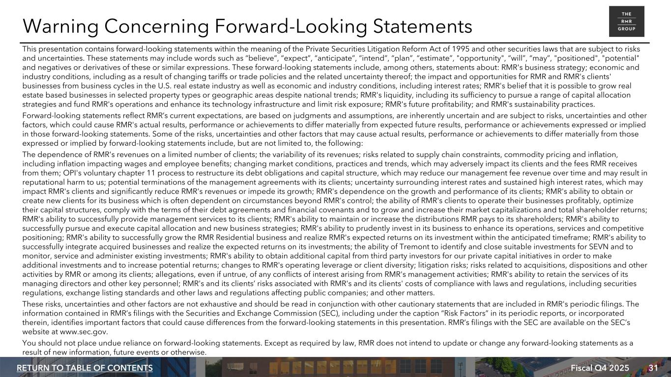 31Fiscal Q4 2025RETURN TO TABLE OF CONTENTS This presentation contains forward-looking statements within the meaning of the Private Securities Litigation Reform Act of 1995 and other securities laws that are subject to risks and uncertainties. These statements may include words such as “believe”, “expect”, “anticipate”, “intend”, “plan”, “estimate”, "opportunity", “will”, “may”, "positioned", "potential" and negatives or derivatives of these or similar expressions. These forward-looking statements include, among others, statements about: RMR's business strategy; economic and industry conditions, including as a result of changing tariffs or trade policies and the related uncertainty thereof; the impact and opportunities for RMR and RMR's clients' businesses from business cycles in the U.S. real estate industry as well as economic and industry conditions, including interest rates; RMR's belief that it is possible to grow real estate based businesses in selected property types or geographic areas despite national trends; RMR's liquidity, including its sufficiency to pursue a range of capital allocation strategies and fund RMR's operations and enhance its technology infrastructure and limit risk exposure; RMR's future profitability; and RMR's sustainability practices. Forward-looking statements reflect RMR’s current expectations, are based on judgments and assumptions, are inherently uncertain and are subject to risks, uncertainties and other factors, which could cause RMR's actual results, performance or achievements to differ materially from expected future results, performance or achievements expressed or implied in those forward-looking statements. Some of the risks, uncertainties and other factors that may cause actual results, performance or achievements to differ materially from those expressed or implied by forward-looking statements include, but are not limited to, the following: The dependence of RMR's revenues on a limited number of clients; the variability of its revenues; risks related to supply chain constraints, commodity pricing and inflation, including inflation impacting wages and employee benefits; changing market conditions, practices and trends, which may adversely impact its clients and the fees RMR receives from them; OPI's voluntary chapter 11 process to restructure its debt obligations and capital structure, which may reduce our management fee revenue over time and may result in reputational harm to us; potential terminations of the management agreements with its clients; uncertainty surrounding interest rates and sustained high interest rates, which may impact RMR's clients and significantly reduce RMR's revenues or impede its growth; RMR's dependence on the growth and performance of its clients; RMR's ability to obtain or create new clients for its business which is often dependent on circumstances beyond RMR's control; the ability of RMR's clients to operate their businesses profitably, optimize their capital structures, comply with the terms of their debt agreements and financial covenants and to grow and increase their market capitalizations and total shareholder returns; RMR's ability to successfully provide management services to its clients; RMR's ability to maintain or increase the distributions RMR pays to its shareholders; RMR's ability to successfully pursue and execute capital allocation and new business strategies; RMR's ability to prudently invest in its business to enhance its operations, services and competitive positioning; RMR's ability to successfully grow the RMR Residential business and realize RMR's expected returns on its investment within the anticipated timeframe; RMR's ability to successfully integrate acquired businesses and realize the expected returns on its investments; the ability of Tremont to identify and close suitable investments for SEVN and to monitor, service and administer existing investments; RMR's ability to obtain additional capital from third party investors for our private capital initiatives in order to make additional investments and to increase potential returns; changes to RMR's operating leverage or client diversity; litigation risks; risks related to acquisitions, dispositions and other activities by RMR or among its clients; allegations, even if untrue, of any conflicts of interest arising from RMR's management activities; RMR's ability to retain the services of its managing directors and other key personnel; RMR's and its clients’ risks associated with RMR's and its clients' costs of compliance with laws and regulations, including securities regulations, exchange listing standards and other laws and regulations affecting public companies; and other matters. These risks, uncertainties and other factors are not exhaustive and should be read in conjunction with other cautionary statements that are included in RMR's periodic filings. The information contained in RMR’s filings with the Securities and Exchange Commission (SEC), including under the caption “Risk Factors” in its periodic reports, or incorporated therein, identifies important factors that could cause differences from the forward-looking statements in this presentation. RMR’s filings with the SEC are available on the SEC’s website at www.sec.gov. You should not place undue reliance on forward-looking statements. Except as required by law, RMR does not intend to update or change any forward-looking statements as a result of new information, future events or otherwise. Warning Concerning Forward-Looking Statements