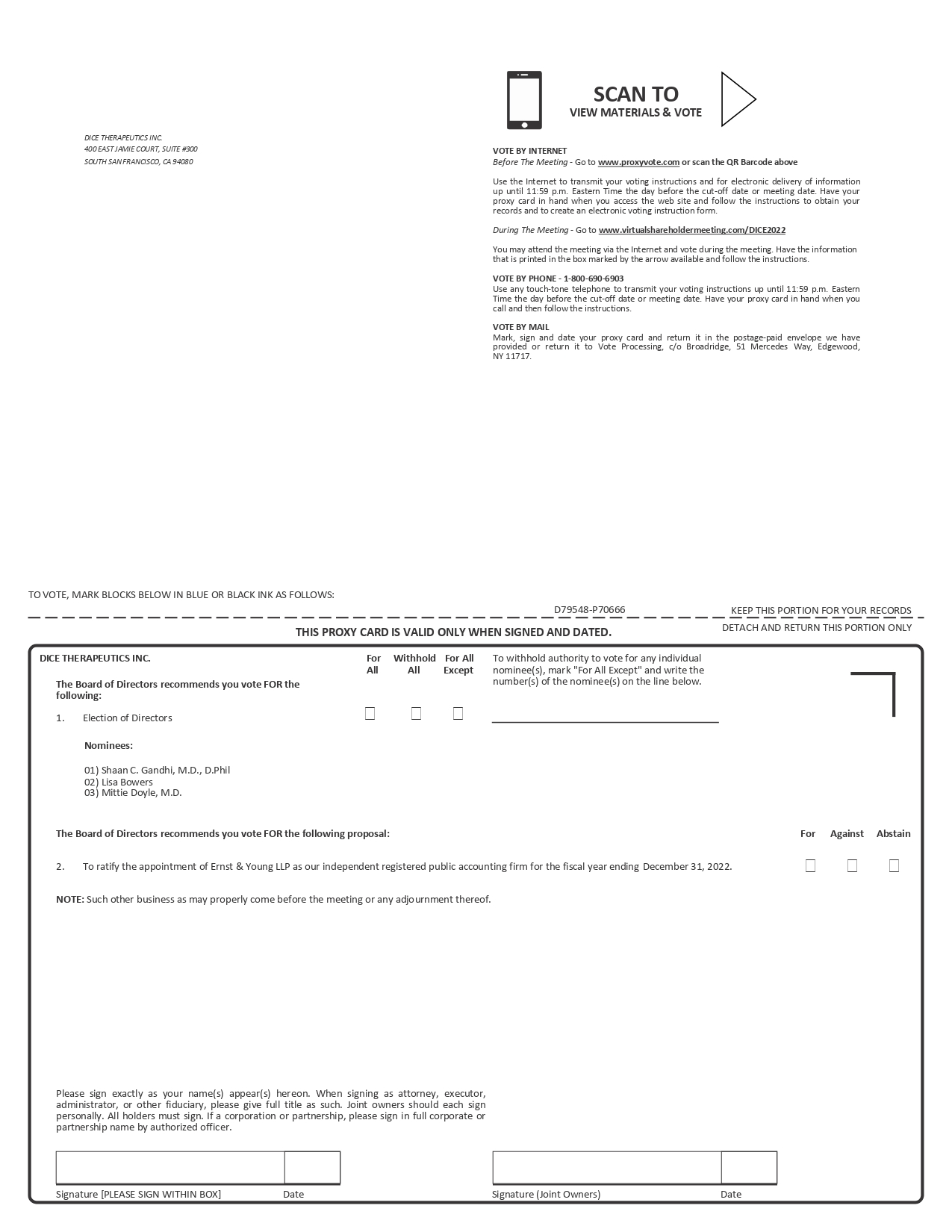 SCAN TO VIEW MATERIALS & VOTE DICE THERAPEUTICS INC. 400 EAST JAMIE COURT, SUITE #300 SOUTH SAN FRANCISCO, CA 94080 VOTE BY INTERNET Before The Meeting - Go to www.proxyvote.com or scan the QR Barcode above Use the Internet to transmit your voting instructions and for electronic delivery of information up until 11:59 p.m. Eastern Time the day before the cut-off date or meeting date. Have your proxy card in hand when you access the web site and follow the instructions to obtain your records and to create an electronic voting instruction form. During The Meeting - Go to www.virtualshareholdermeeting.com/DICE2022 You may attend the meeting via the Internet and vote during the meeting. Have the information that is printed in the box marked by the arrow available and follow the instructions. VOTE BY PHONE - 1-800-690-6903 Use any touch-tone telephone to transmit your voting instructions up until 11:59 p.m. Eastern Time the day before the cut-off date or meeting date. Have your proxy card in hand when you call and then follow the instructions. VOTE BY MAIL Mark, sign and date your proxy card and return it in the postage-paid envelope we have provided or return it to Vote Processing, c/o Broadridge, 51 Mercedes Way, Edgewood, NY 11717. TO VOTE, MARK BLOCKS BELOW IN BLUE OR BLACK INK AS FOLLOWS: D79548-P70666 KEEP THIS PORTION FOR YOUR RECORDS THIS PROXY CARD IS VALID ONLY WHEN SIGNED AND DATED. DETACH AND RETURN THIS PORTION ONLY DICE THERAPEUTICS INC. For Withhold For All To withhold authority to vote for any individual The Board of Directors recommends you vote FOR the following: All All Except nominee(s), mark "For All Except" and write the number(s) of the nominee(s) on the line below. 1.Election of Directors Nominees: 01) Shaan C. Gandhi, M.D., D.Phil 02) Lisa Bowers 03) Mittie Doyle, M.D. The Board of Directors recommends you vote FOR the following proposal: 2.To ratify the appointment of Ernst & Young LLP as our independent registered public accounting firm for the fiscal year ending December 31, 2022. For Against Abstain NOTE: Such other business as may properly come before the meeting or any adjournment thereof. Please sign exactly as your name(s) appear(s) hereon. When signing as attorney, executor, administrator, or other fiduciary, please give full title as such. Joint owners should each sign personally. All holders must sign. If a corporation or partnership, please sign in full corporate or partnership name by authorized officer. Signature [PLEASE SIGN WITHIN BOX]DateSignature (Joint Owners)Date